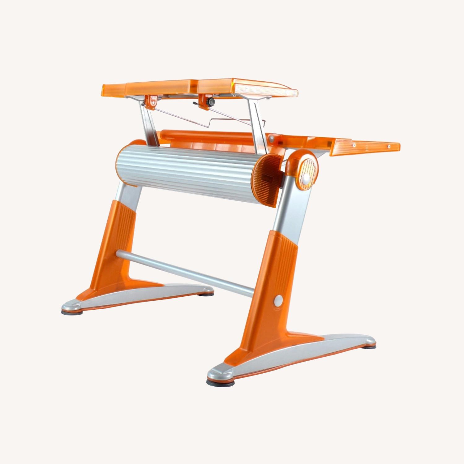 Seller's Notes:A very unique computer desk from the early 2000s that was made by Comta for the iMac G3 series of desktop and laptop computers that launched Apple to prominence. A classic design still sought after by collectors. While the iMacs themselves aren't too difficult to track down the matching desks have all but disappeared. This one had some damage when I found it, but I have repaired it and restored the missing pieces. It's a striking and nostalgic piece that is also sturdy and functional. It includes two shelves, a hidden cord organizer, and lots of clever little compartments to hold all manner of accessories. Would be really great for someone who works at a computer, especially if you need multiple screens or a tablet etc. The desk layout translates surprisingly well modern tech setups for streaming, gaming, digital art, and more. It's honestly just very cool and I put a lot of effort into fixing it up, so I'd love to see it go to someone who can appreciate a fun cultural artifact.