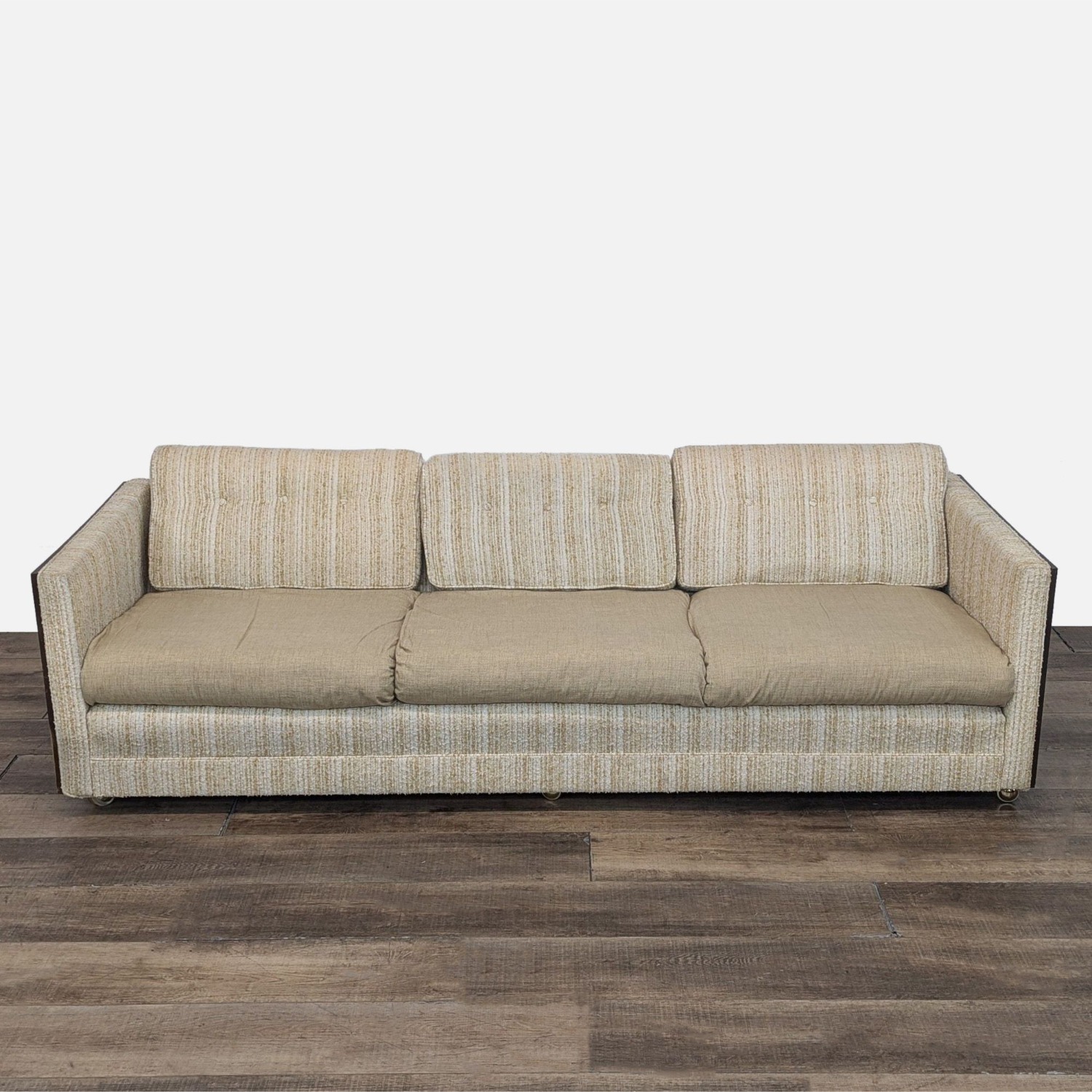 Seller's Notes:Vintage sofa with wood frame, front caster wheels and cream fabric.