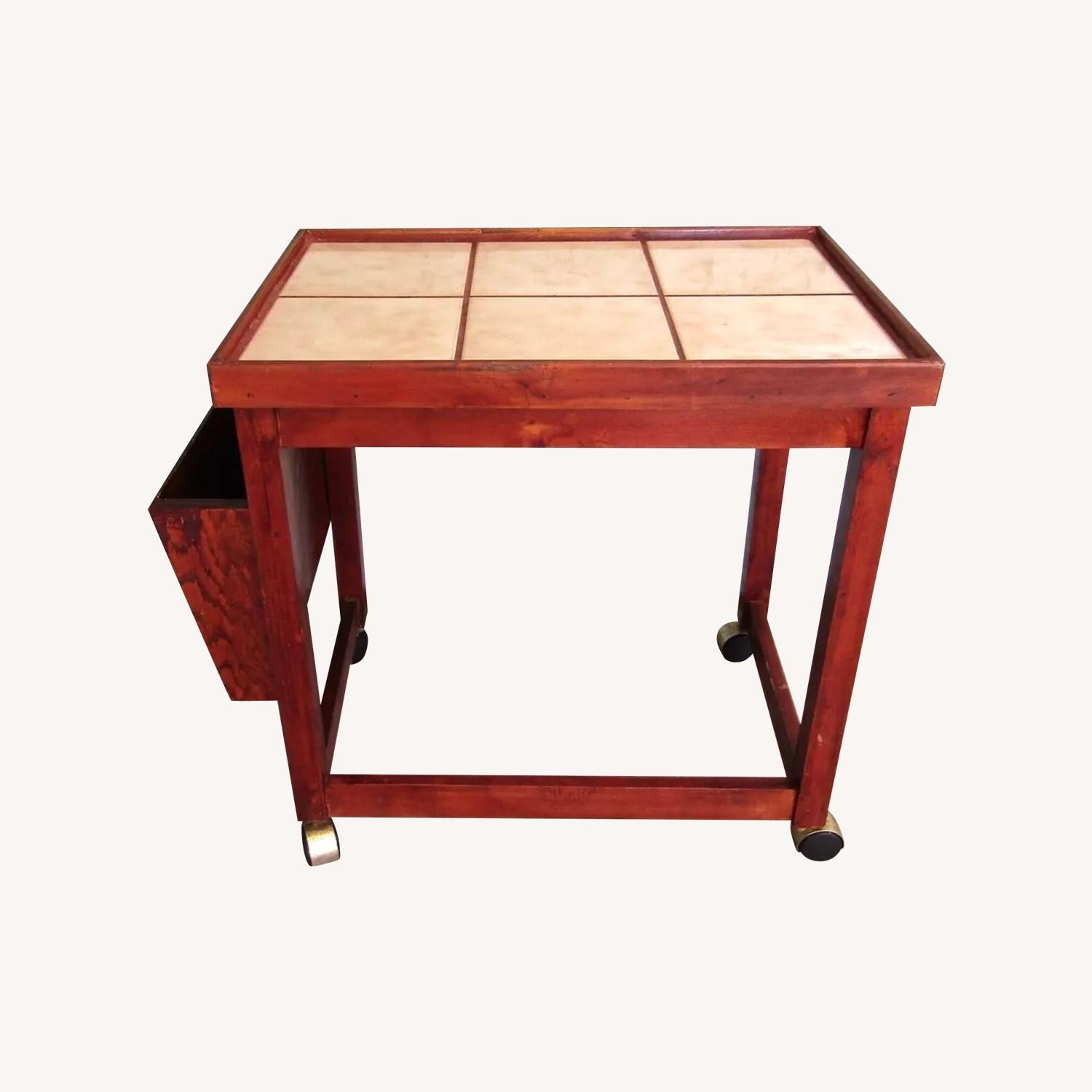 Seller's Notes:Vintage Danish Modern Teak and Tile Top Rolling Side Table with Magazine Holder On four covered castors, magazine holder on the side, knee space too. Measures 25 1/4" long, 17 1/4" wide and 25 1/4" tall.