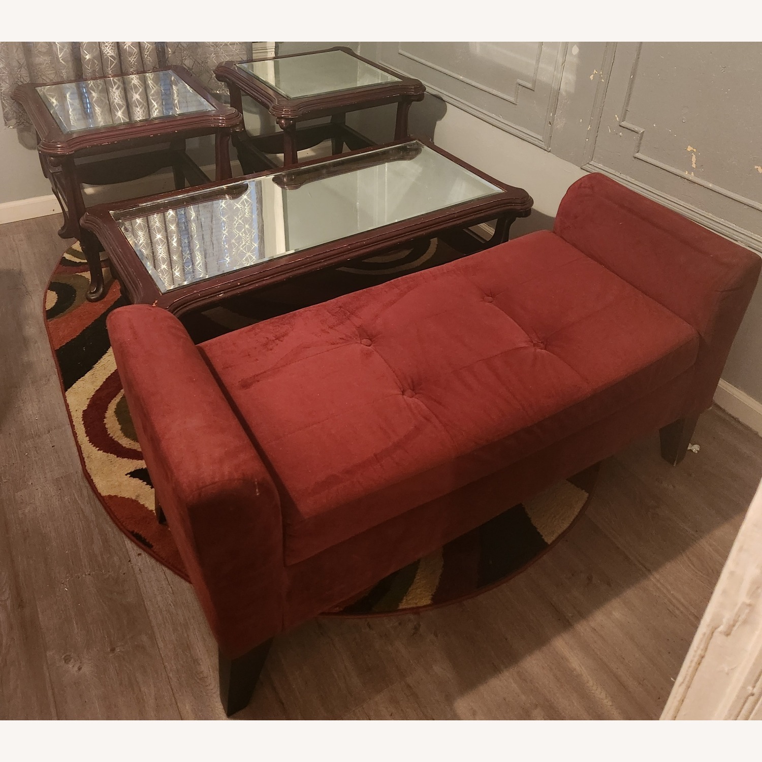 Seller's Notes:An antique-style coffee table, with dark red mahogany wood. The mirror top is included, but there's a crack on one of the corners (shown in the picture). Scratches and signs of wear are consistent with its age. Also included are two matching side tables. They have fewer scratches, and both mirror tops are in pristine condition. Length, Width & Height = 24, 24, 24 1 oval, multicolored, abstract area rug Finally, 1 red upholstered storage bench with some visible wear. Dark brown, wooden legs and button tufting. Length, Width & Height = 52, 20, 24 Ornate detailing, perfect for a restoration or upcycling project.