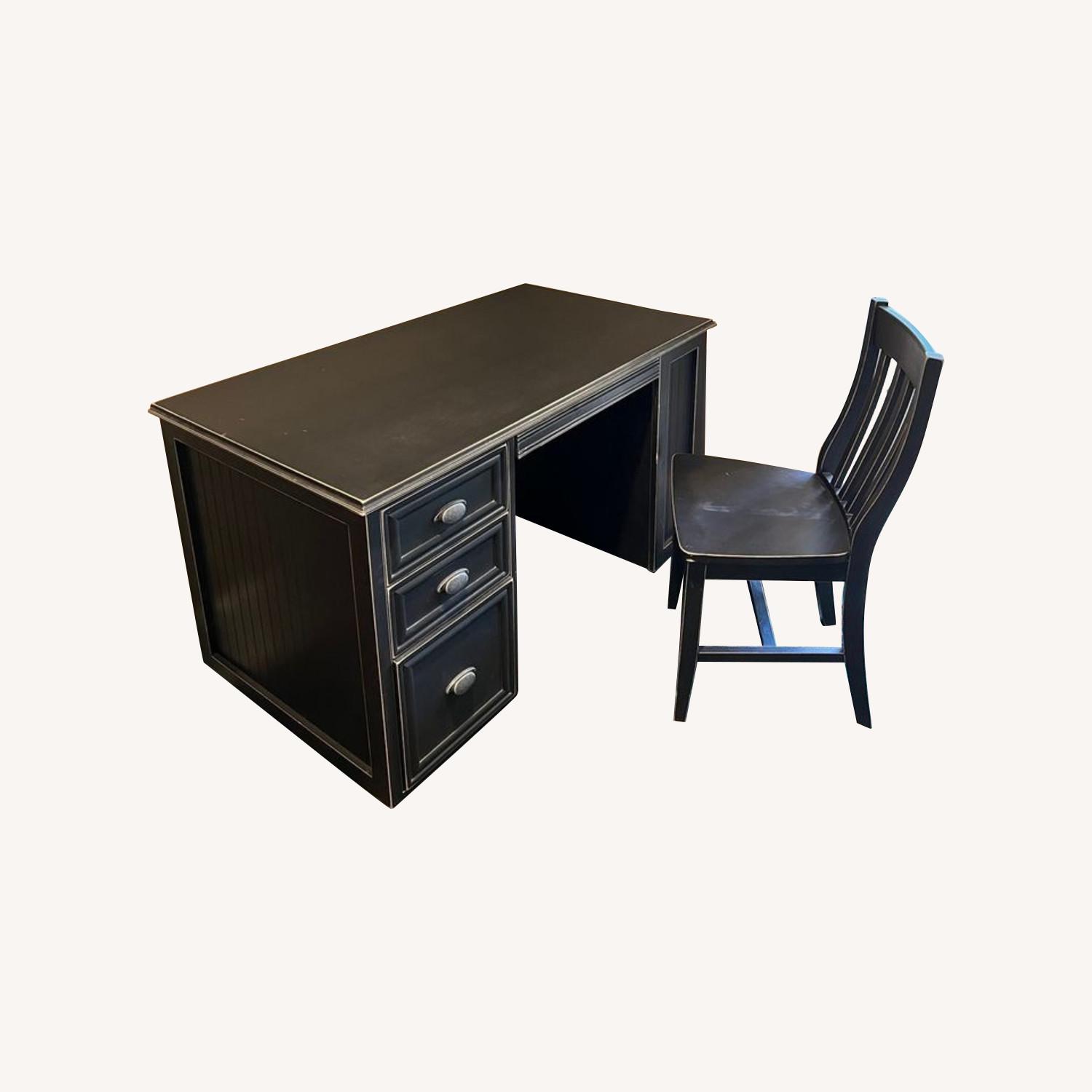 Seller's Notes:Like new Vintage designer executive black desk with distressed paint. Solid wood, Heavy. Three drawers on the side and one in the middle. Brushed steel handles. Comes with matching chair. Desk: 49"L x 27.5W x 31"H Chair: Seat 18.5"H x 18"w x 15.5"Deep overall height 36"H