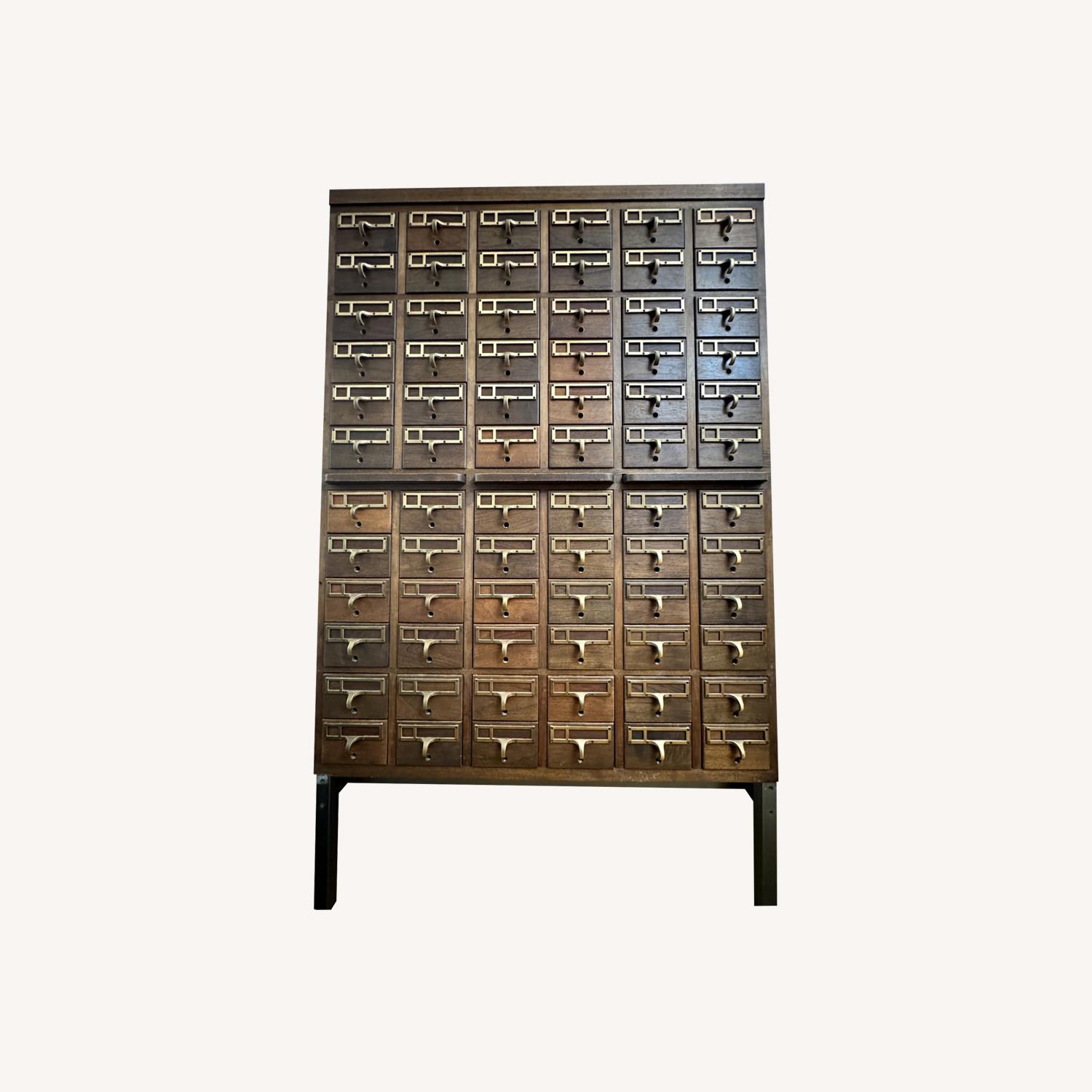Seller's Notes:This is a 72-drawer Dewey Decimal Library Cabinet made what we believe is Birch and Walnut with Dovetail draws and brass hardware.
