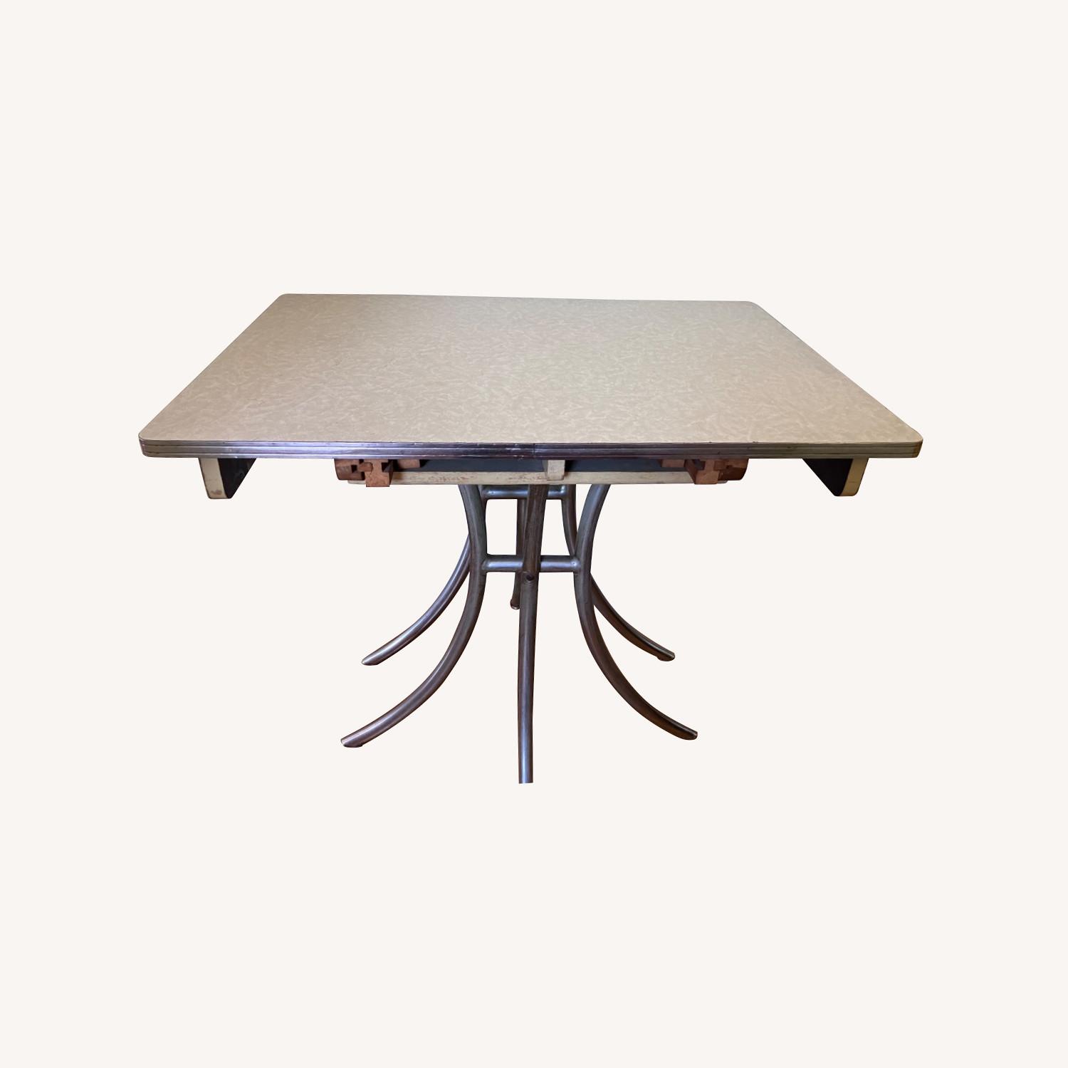 Seller's Notes:This is a formica top dining room table with rounded corners, metal edging, is graceful, middle feet. It looks like it could be long in an old diner, but in fact, comes from a friend’s grandmother. It has been in my pet free and smoke free home for the last several years and is looking for a new owner who appreciate its history and character.