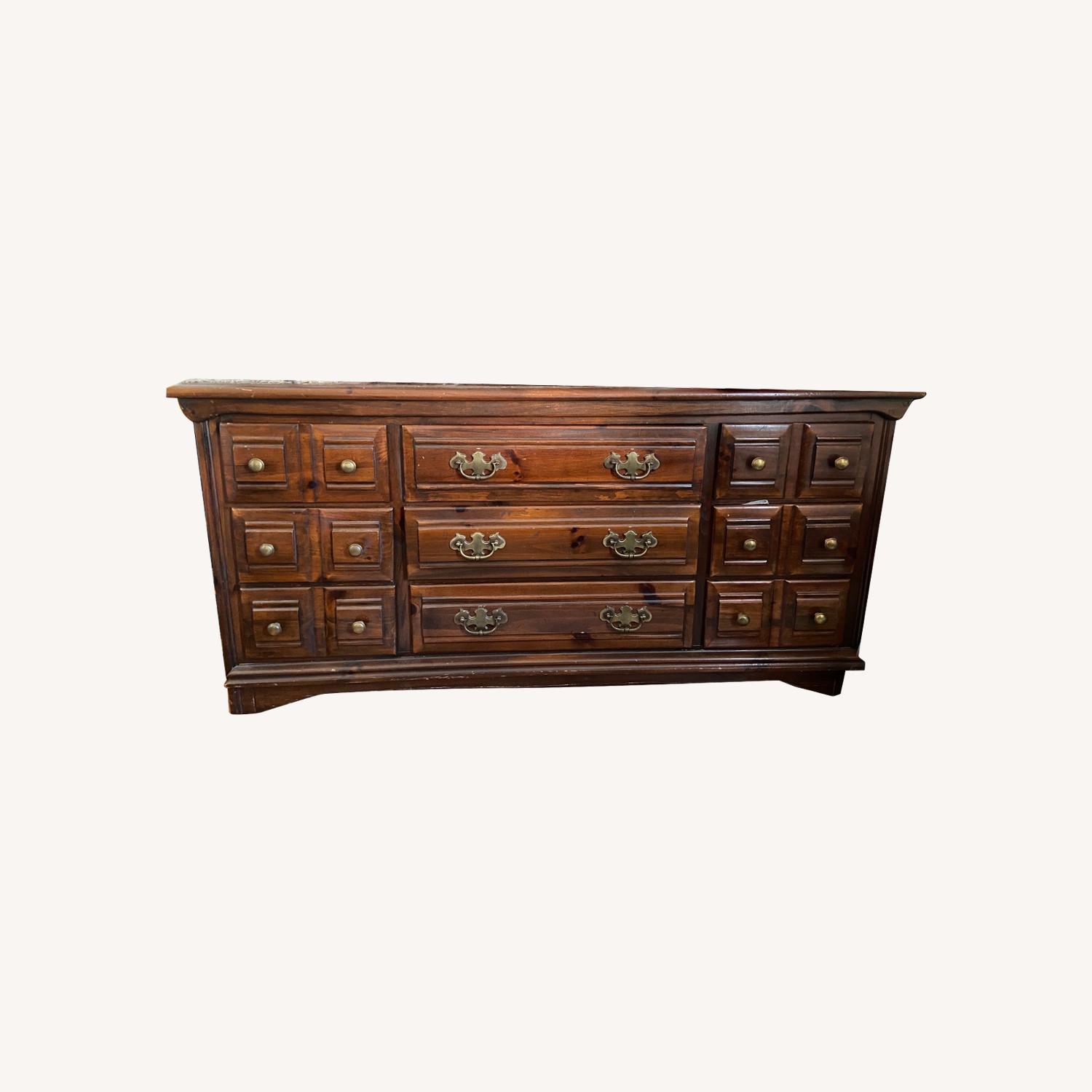 Seller's Notes:9-drawer antique dresser. Has a "distressed" look. It's lived a full life! My mother passed it on to me when I moved to NYC years ago. Once upon a time it had a large mirror that attached to the back. Drawers work fine, and are deep and have tons of space. Solid wood. Heavy. Has some scuffs and discoloration, but details have quite a bit of character. Could look like new for someone that is good at DIY restoration too.
