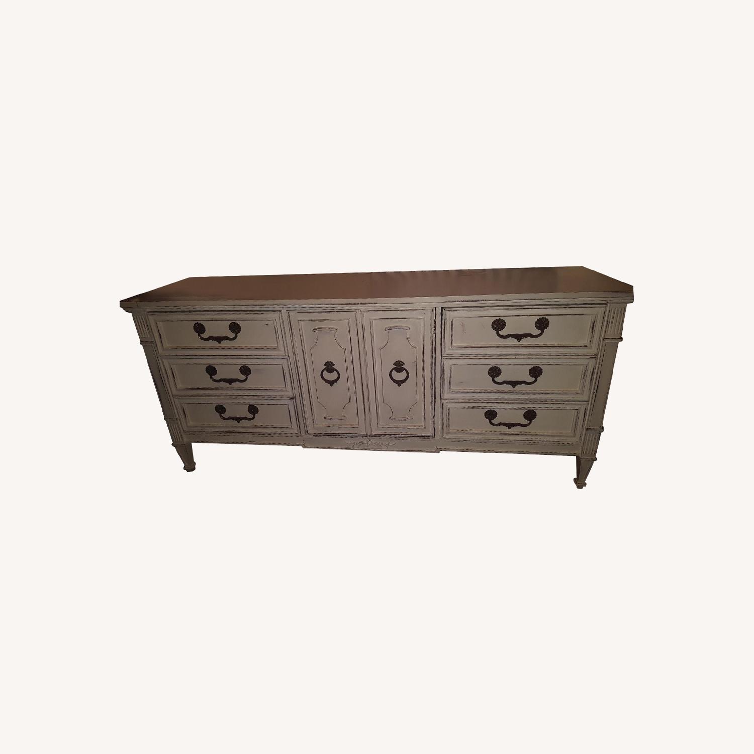 Seller's Notes:Vintage dresser purchased as an upcycled piece from antique store 6 years ago. It has been upcycled with white chalk paint with intentional distress and wear. Has some minor knicks on top, and the side panel lip has fallen off but can be adhered as is still in one piece and will come with dresser. Lovely low rise and long, making it great for using as a changing table in a nursery or tv stand in any room- with 9 storage drawers! Is solid and heavy!
