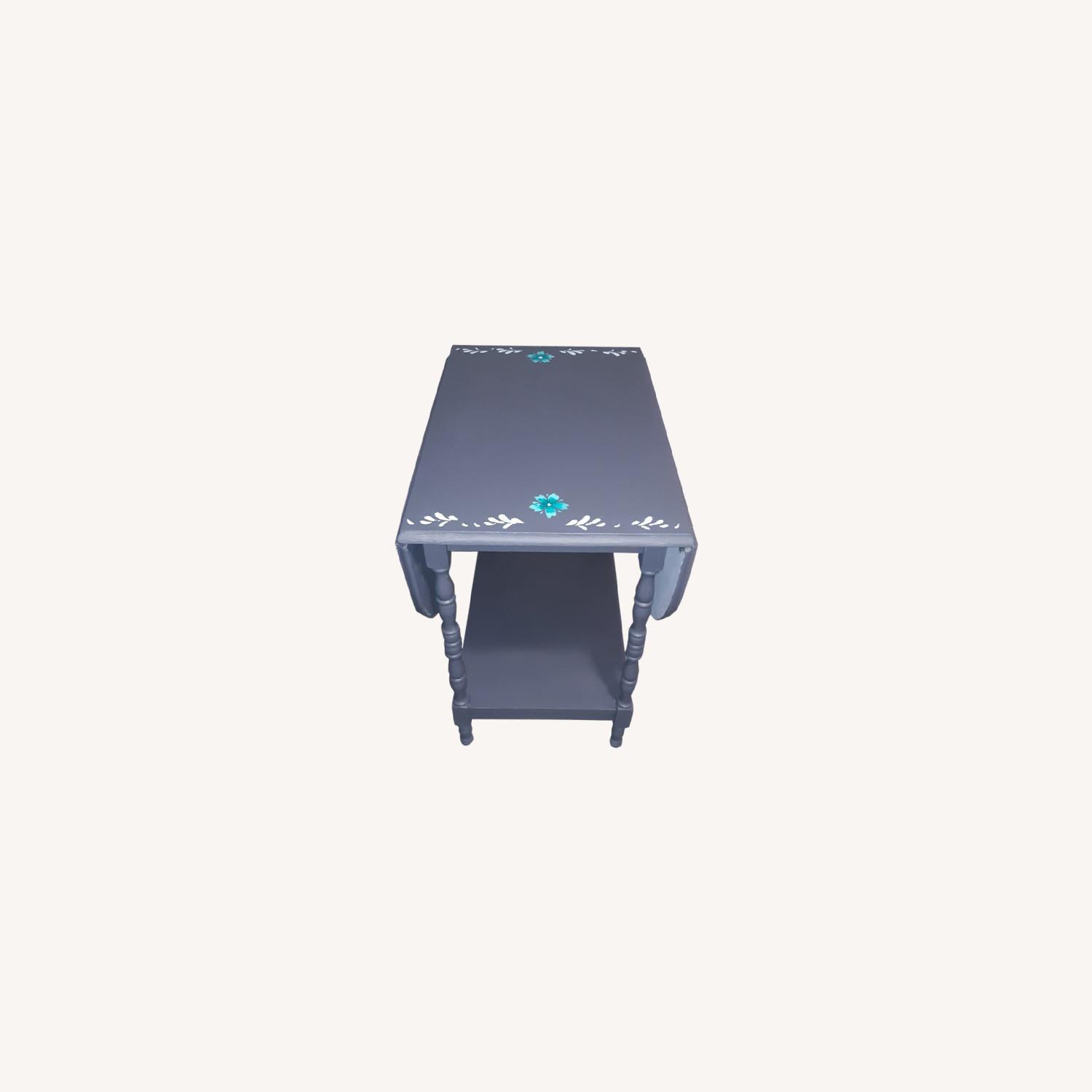 Seller's Notes:This is a sturdy vintage drop leaf side table. It is very functional because it transforms from a 17.5" x 25" tabletop to a 35.5" x 25" in a moment when side leafs are lifted. Or lift just one side only. The brackets under leafs are metal and sturdy, great working order. The dragonfly motif makes it a showpiece, as well as being versatile and functional. Base is charcoal color, with teal accents.