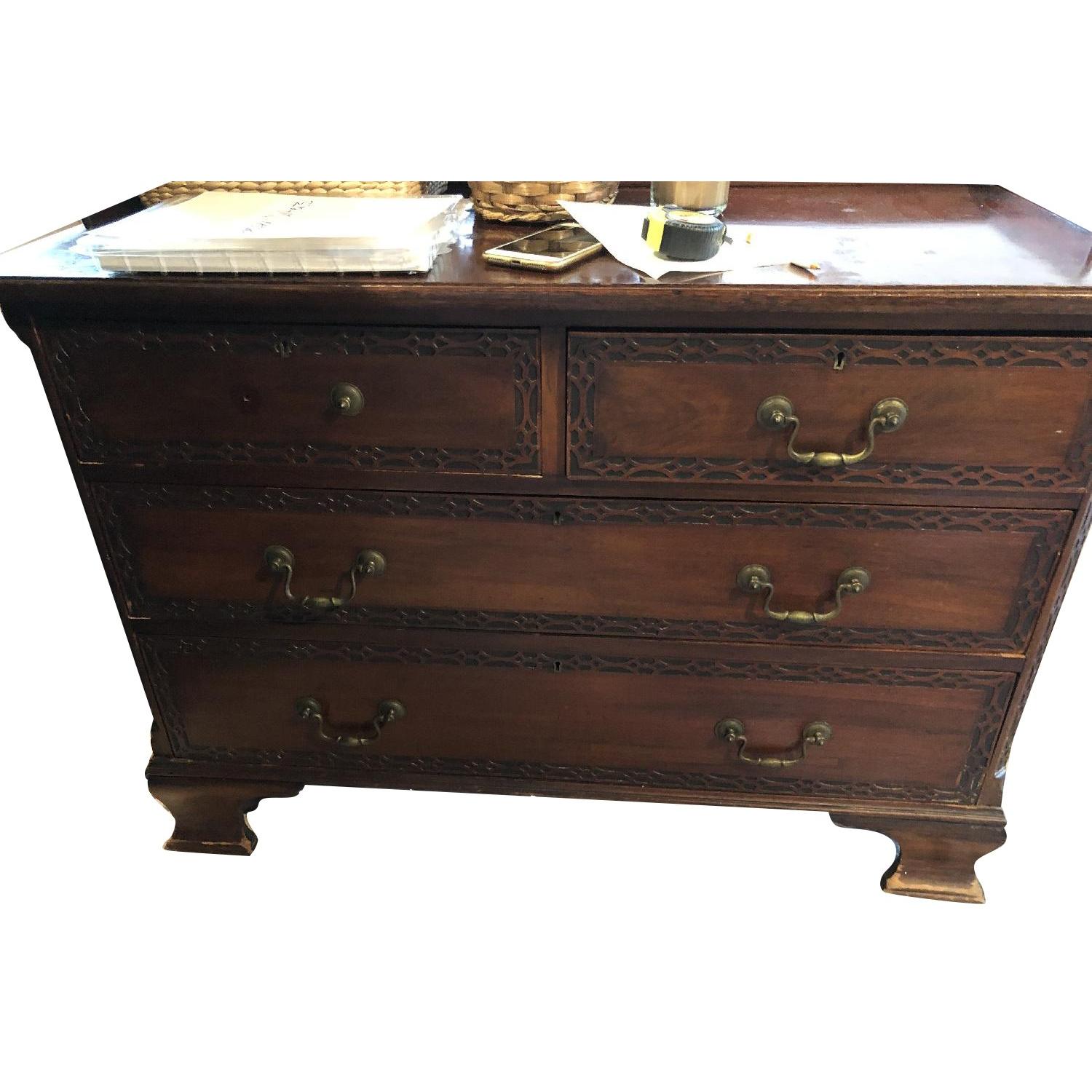 Seller's Notes:Solid English dresser with clean shelves but damaged top. Attractive carved wood