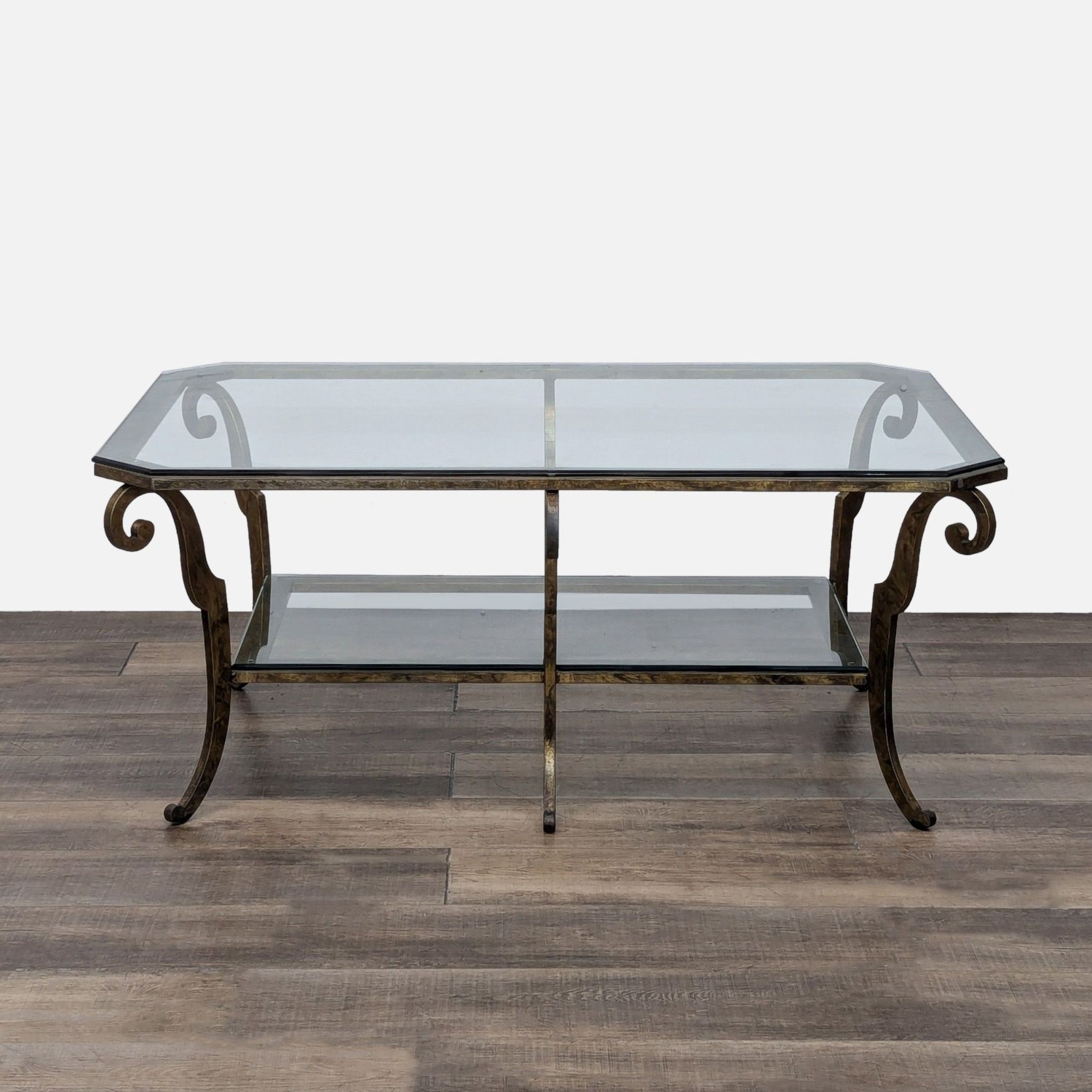 Seller's Notes:Antiqued iron frame with glass top and shelf.