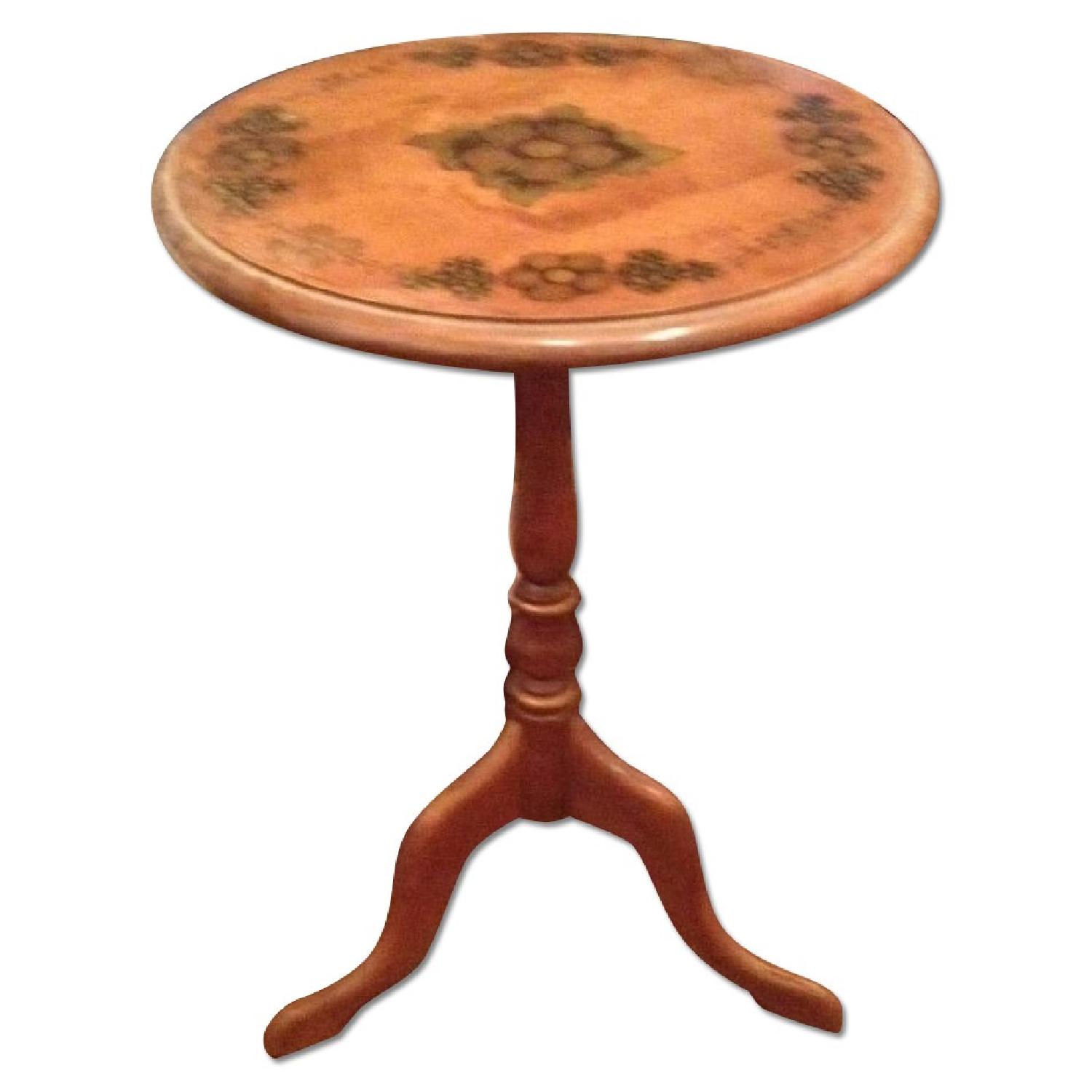 Seller's Notes:This was my parent's. Both are deceased and I am clearing the house and estate. This is an Ethan Allen side table light brown with an American motif on the top. The spindle has gold leaf in two parts. This dates to the late 1960's or early 70's. I am not certain of the exact age. Today Ethan Allen does not offer this style of side/accent table. The closest match is their Finland Accent Table which lists at $500.00.