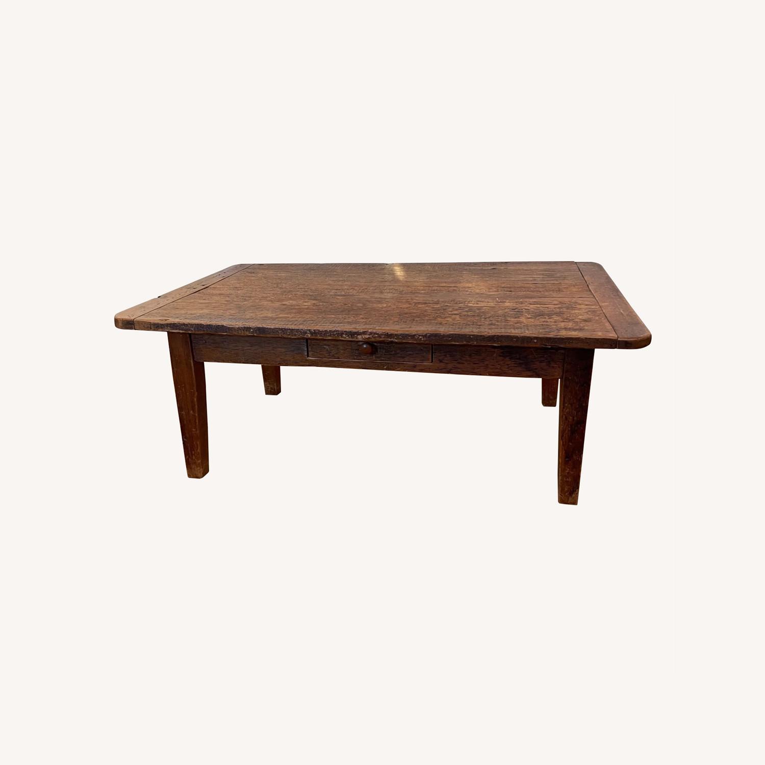 Seller's Notes:Vintage farmhouse coffee table with a lot of love left to give. Great size. Small drawer to hold remotes etc. Front left leg is slightly wobbly but could be repaired. The wood is worn/rougher side. Have had this piece for years only selling because it's too large for our space.