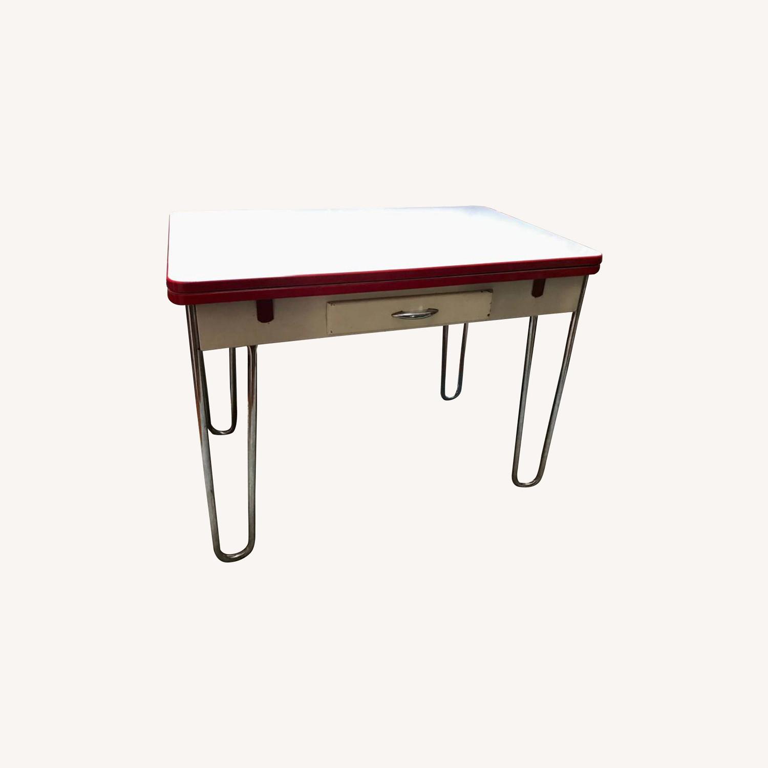 Seller's Notes:Vintage farmhouse enamel porcelain top metal table. Mid century rare metal table with white metal top, red trim, in excellent condition.