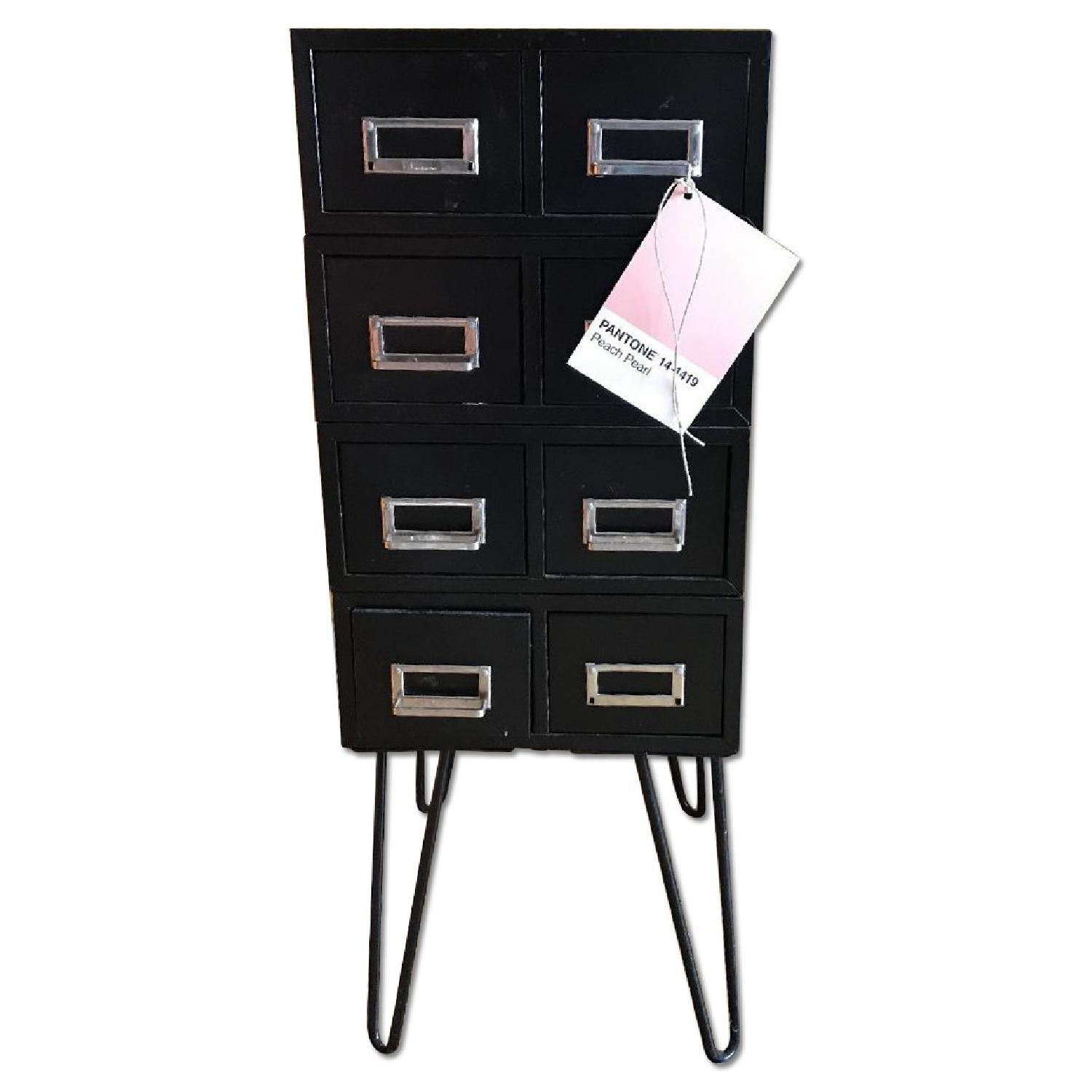 Seller's Notes:Bought off etsy, refurbished 8 drawer recipe or flash card sized file cabinet with eames mid century modern style leg. Each set of drawers comes apart and locks into the set below from the back. Two handles are missing. Otherwise it's a bit dusty ! I used it for my eyewear collection.