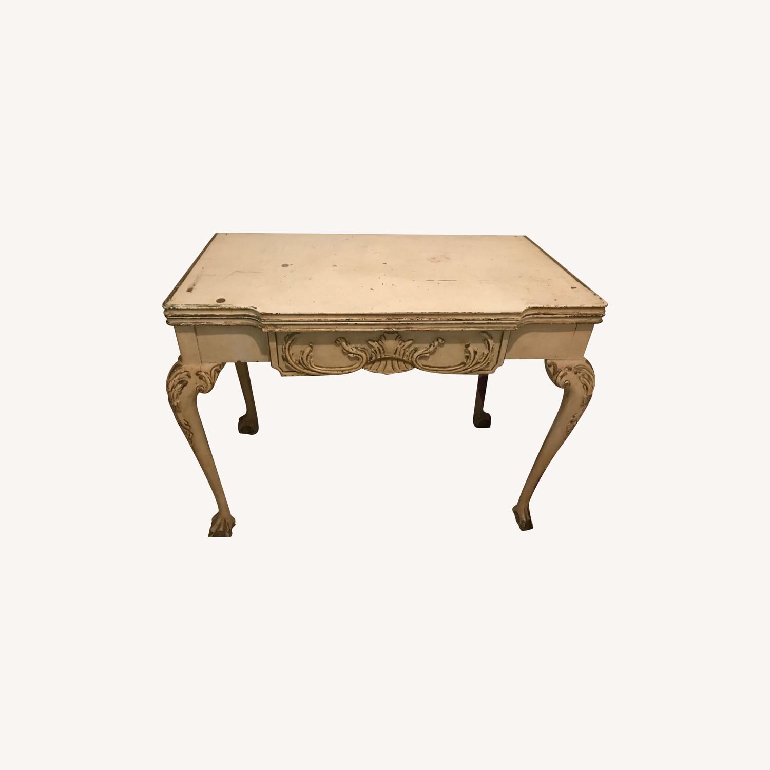 Seller's Notes:This desk also doubles as a table! It has amazing gold trim and very detailed feet. It also folds out into a larger table, with a support that comes down. The desk folded IS NOT WOBBLY. It is just a but wobbly when extended. The second dimensions are: 41 x 38 x 30.5