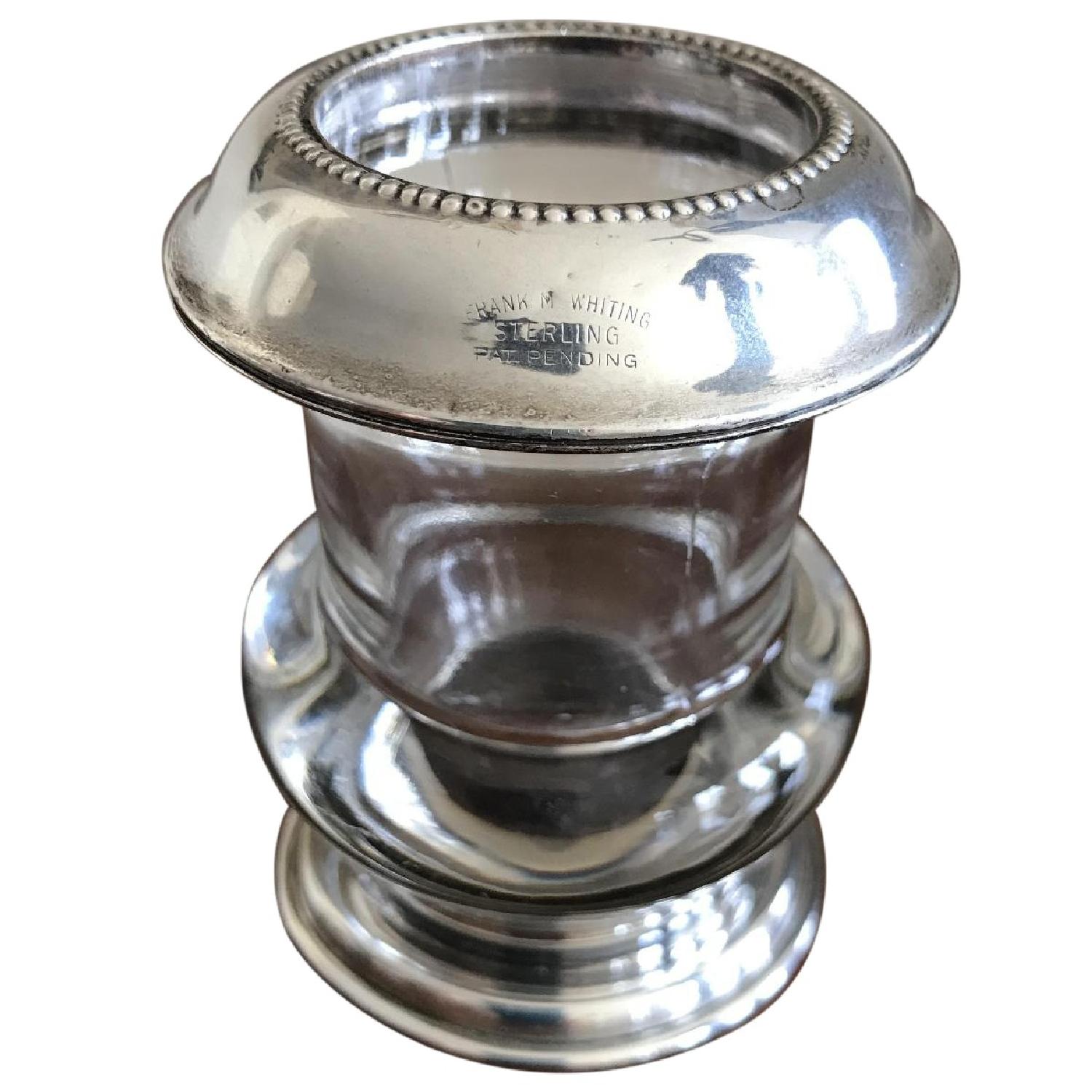 Seller's Notes:Frank Whiting Glass/Sterling Silver Toothpick Holder stamped on top there are a few dings in the sterling silver at rim depth: 2.5" width: 2.5" height: 3-1/8"