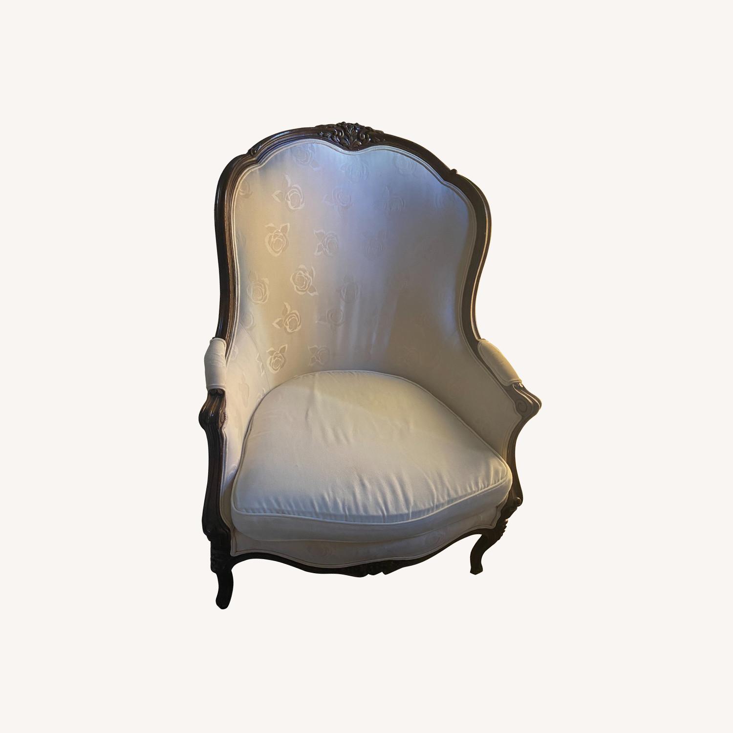 Seller's Notes:Elegant French-style accent chair with carved wood frame and rose-patterned ivory upholstery. Good condition with minor cushion wear.