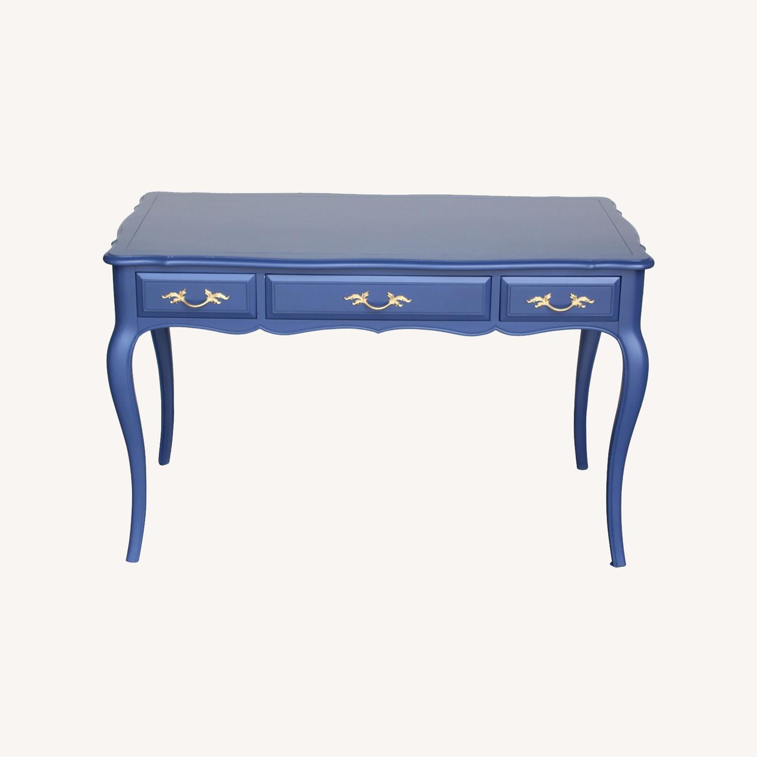 Seller's Notes:Vintage French Provincial desk of three drawers. This desk is solid built with dovetail joints is professionally refinish in blue with satin top coat, and gold painted hardware. Dimensions: 48"Width x 25"Depth x 30"Height. See pictures and conditions for reference. Professionally refinished, Good Condition, Original Design Modified, vintage piece, may have some minor imperfections. If you have any question, please let us know, thank you.