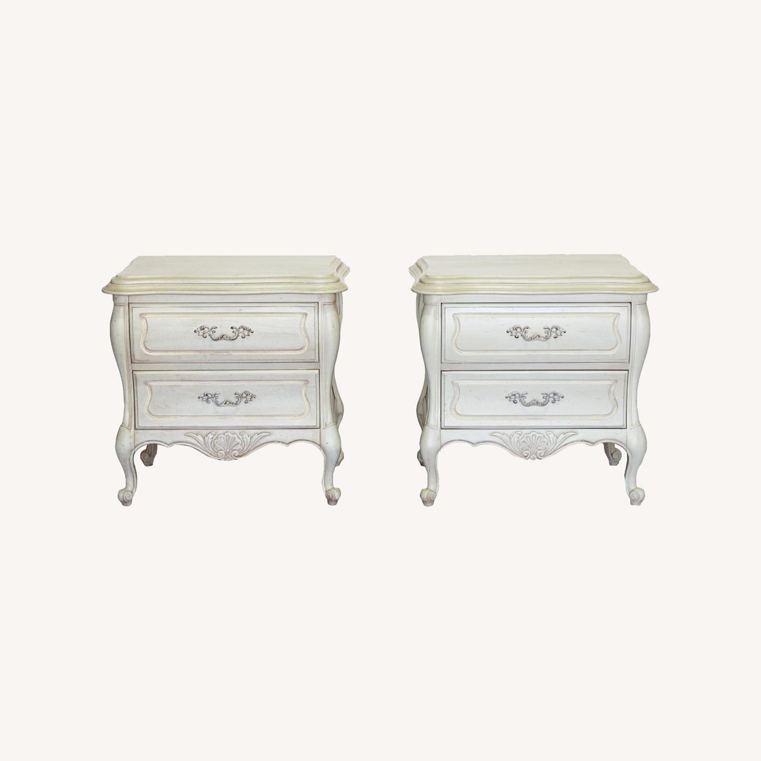 Seller's Notes:Vintage pair of French style nightstands. The nightstands are in great vintage condition. Dimensions; 27" Width x 18" Depth x 25" Height. See pictures and condition for reference. Good Condition, Original Condition Unaltered, vintage piece, may have some minor imperfections. (color and finish can be modified per client’s request) If you have any question, please let us know, thank you.