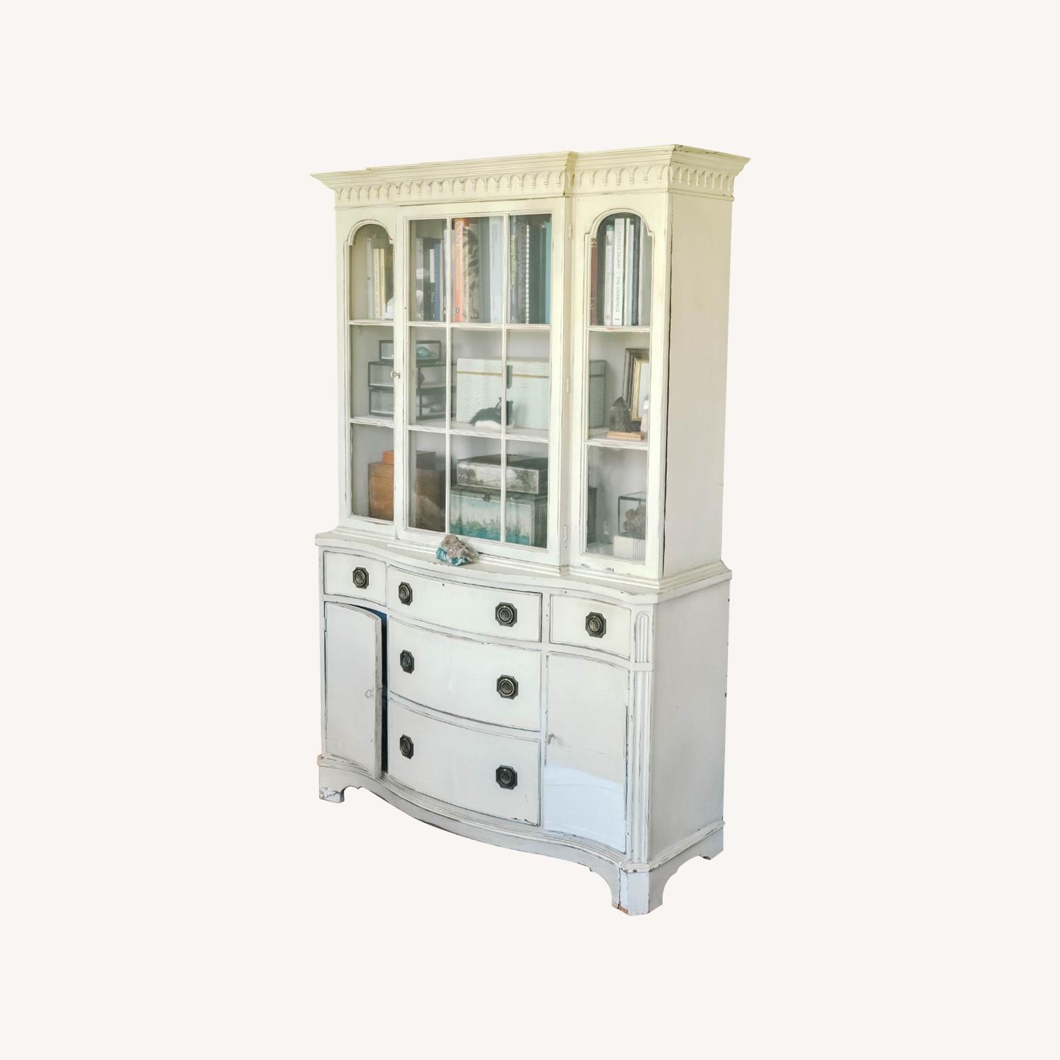 Seller's Notes:I bought this at an antique warehouse in Connecticut about 15 years ago. It has so much character! Glass front cabinet with a working lock and key and 3 shelves. Below there are 3 big drawers, 2 small drawers, and 2 door compartments. I fit all of my books, crystals, and art supplies in it. It's been indispensable in a small Brooklyn apartment without a lot of closets. This piece is old. I've tried to take photos of all of the "flaws" (I think they are charming!): • the back right corner needs blocks to sit evenly - once you get the cabinet in place it feels very stable and strong, but you have to do some finessing to make sure it's supported • some of the front veneer has chipped off and has been painted white • some of the decorative trim has fallen off If you like pristine furniture, this is not for you. If you have a quirky vintage vibe, you will love this!