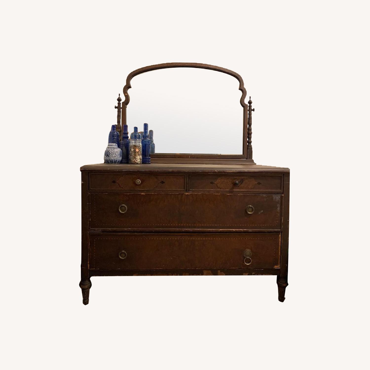 Seller's Notes:Well-worn/shabby chic, vintage, antique dresser. Not sure exactly how old it is, as we purchased it from an antique store ourselves. Has some water stain damage, mismatched hardware and wood is chipping around bottom a bit, but it's all part of the charm! Dresser is sizable with roomy drawers. Big matching mirror in great condition.
