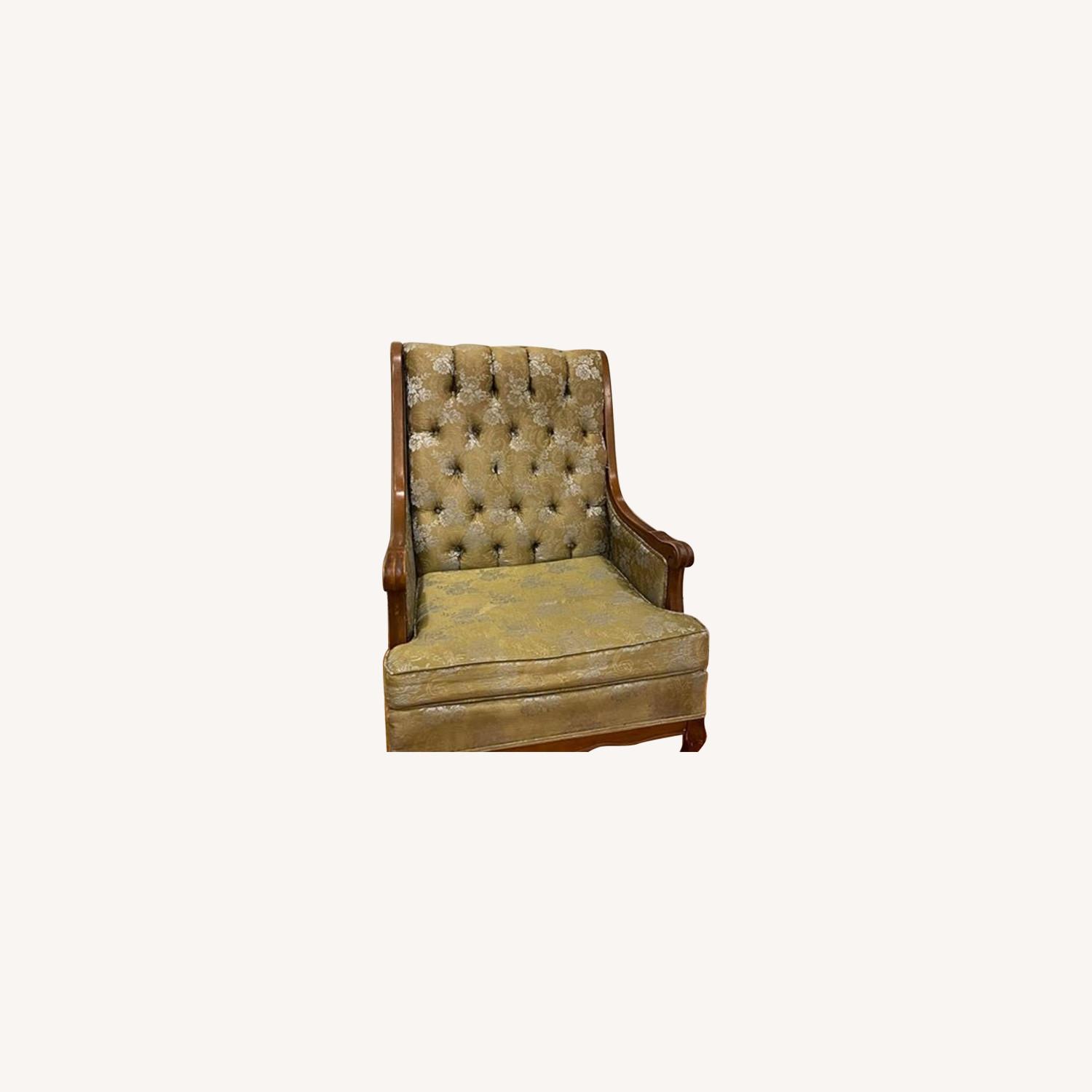 Seller's Notes:Vintage green wooden chair with blue floral fabric, has a few scratches on the sides and top but is overall in pretty good condition!