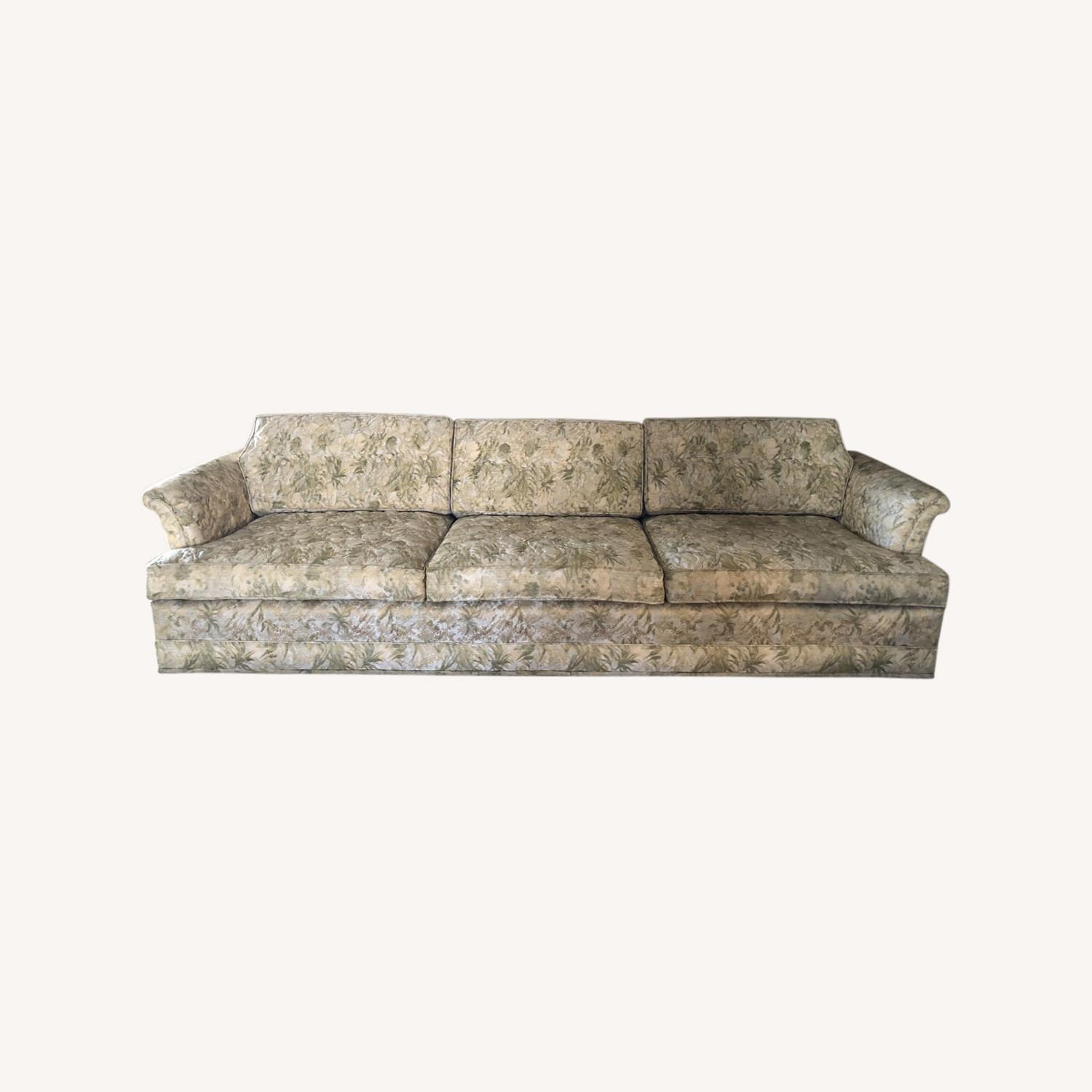 Seller's Notes:My parents built their first home in Lodi wine country in the '60s and furnished it with new furniture. This couch was one of the pieces. It was purchased from Breuner's Home Furnishing and situated in the sunk in living room. When they downsized and relocated at the turn of the century to a mobile home, the couch followed. Given that it has primarily been used as a decorative piece, it remains in excellent condition. The couch has a sort of island feel to it. It is soft cream, green, and gold giving it a neutral, almost beige appearance from a distance. The colors are much more vibrant up close. The pattern suggests abstract palm leaves. There are however delicately embroidered laurel leaves that change color depending on the lighting. The embroidery can appear pale cream, bright golden yellow, and burnt rust. Decorative quilting has been used on the back cushions.