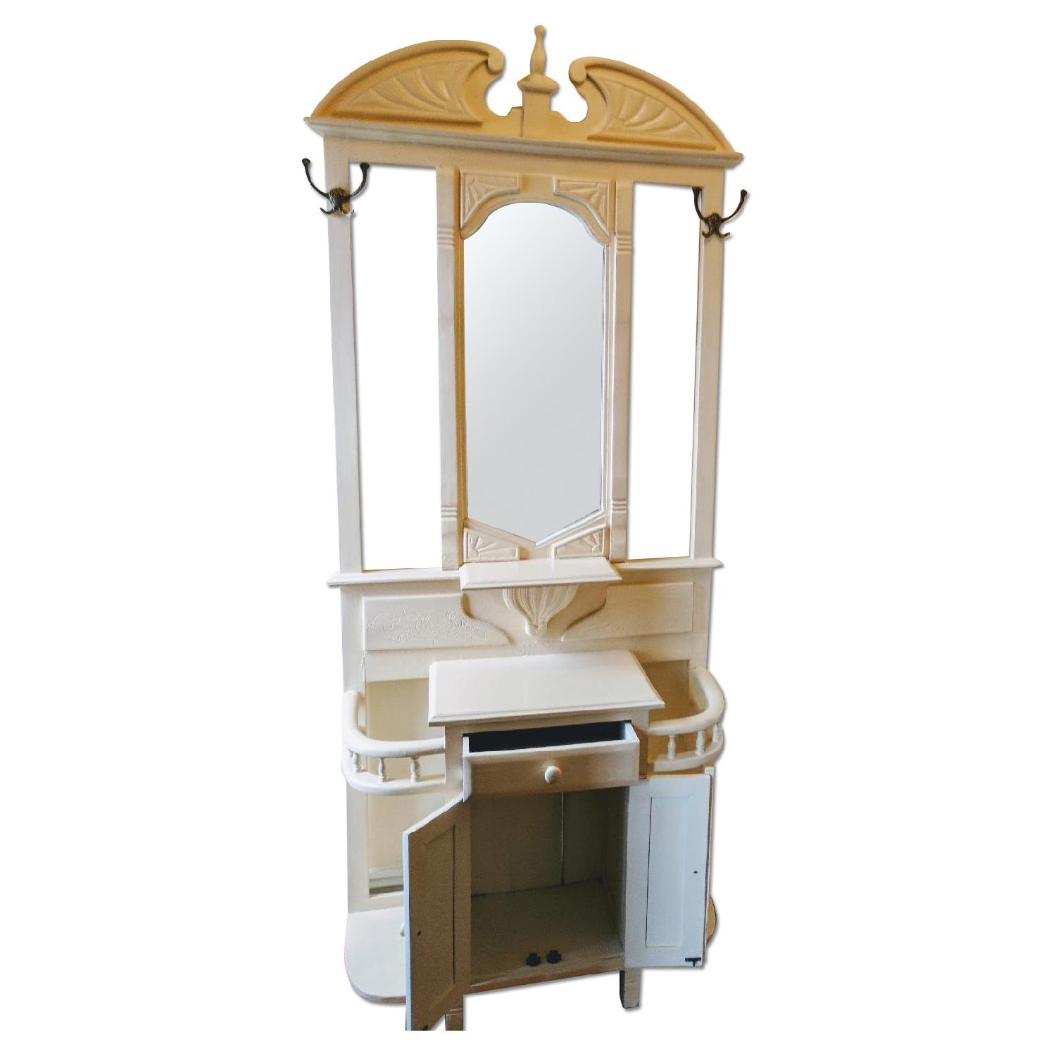 Seller's Notes:Incredible vintage hall tree in excellent condition - there are two quadruple hooks, a mirror, a drawer, and a cabinet, as well as additional storage for umbrellas, etc, on the sides.