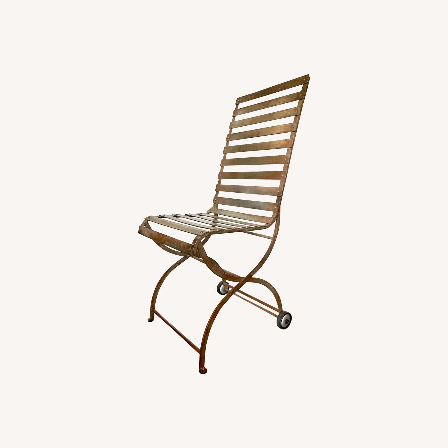 Seller's Notes:Looking for a new home for these four loved chairs, which have been at my dining table for many years. They were vintage when I purchased them, so I can only guess at their age. They are extremely heavy, solid, and sturdy, with a patina that one would expect with vintage steel. While they are a matched set, two chairs have rubber wheels on their back legs and the other two just have four steel feet-- the variation looks to be how they were originally built. (There are rubber caps on the feet in the photos, which I put on to protect my floors.) The chairs have a unique industrial/primitive vibe that always garners a lot of attention. The welds are all solid and quite obviously hand done. Seat height is 18.5 inches, seat depth is around 13". I used them with Ikea chair cushions (not included) on the seats and backs-- very easy to attach with the slats, and nice to have for comfort. I don't see a maker's mark on any of them and, while I've searched for similar chairs, I've yet to find a match.
