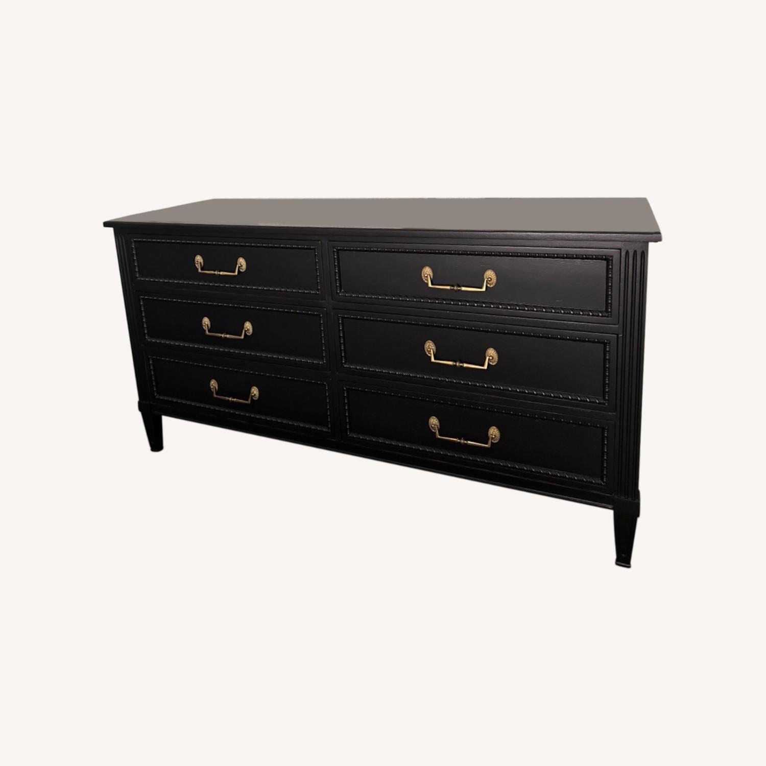 Seller's Notes:I find and restore, or custom finish, old furniture. This piece has been thoroughly cleaned and refinished in a matte, coal black, and contemporary look. The hardware is original and stunning. Leaving no reason to change. All drawers open and close perfectly.