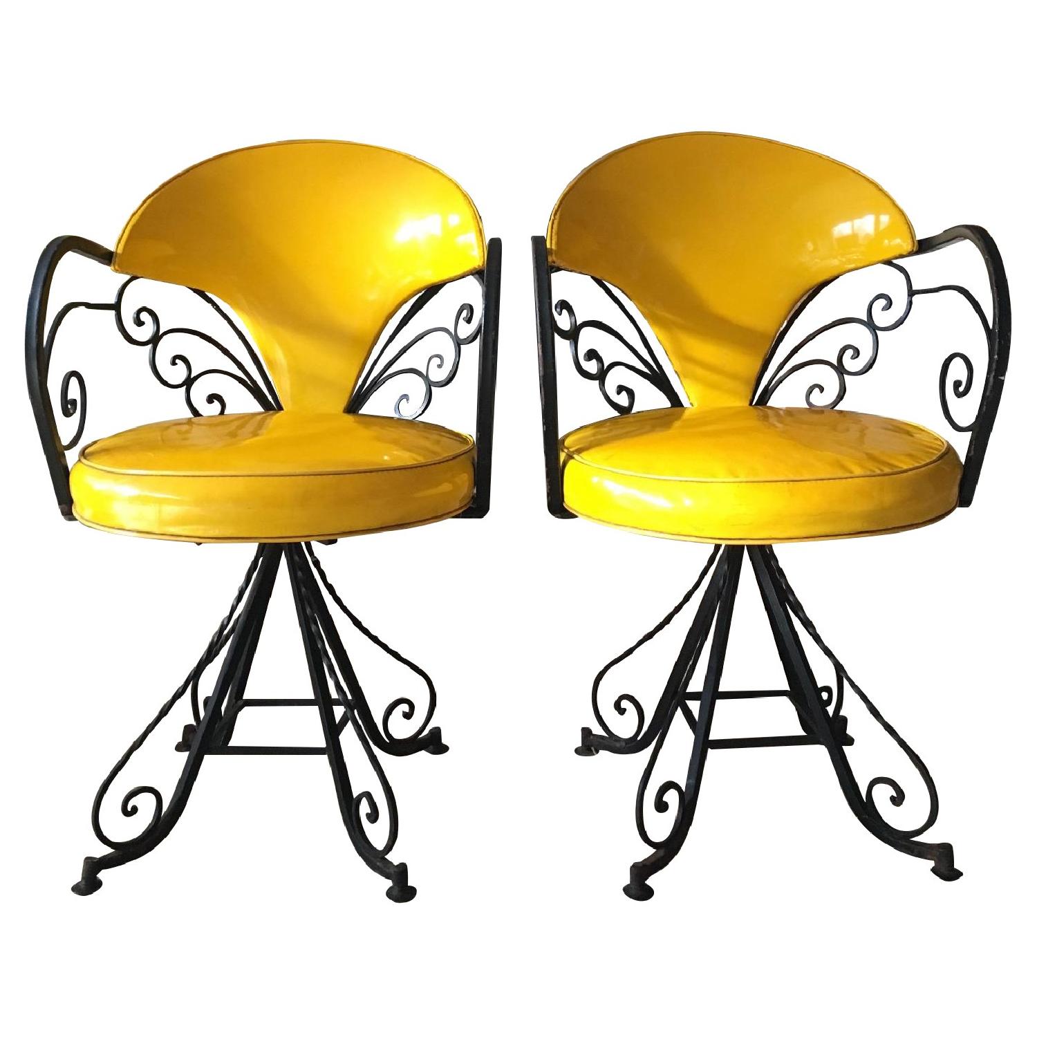 Seller's Notes:Fabulous pair of yellow regency style swivel chairs. Ornate black iron frames, great accents. No rips or tears in the vinyl. Solid. In the style of designer Arthur Umanoff. Circa 60's. Seller can deliver curbside for $75.