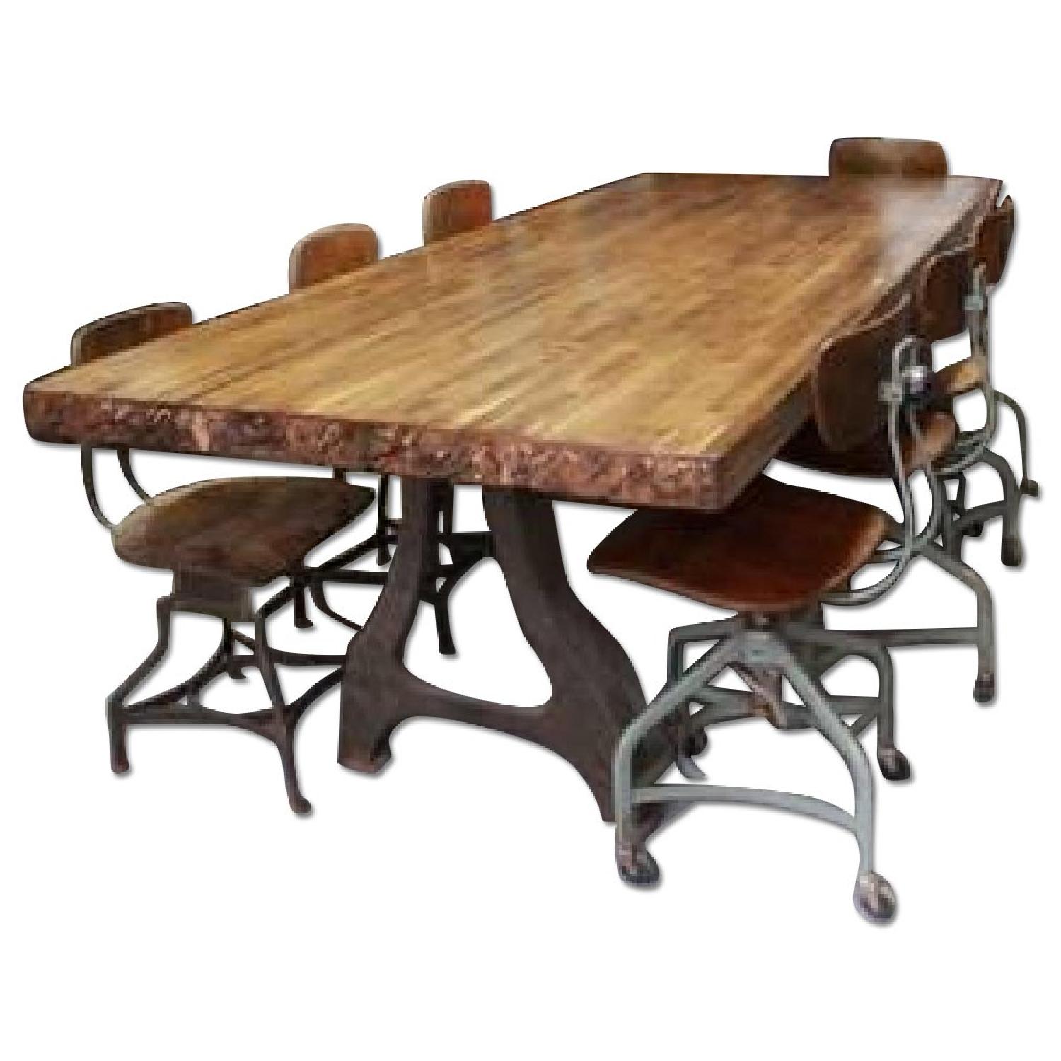 Seller's Notes:Selling this gorgeous, custom 8' long dining table made with antique reclaimed bowling alley measuring 2.5" thick. The table top is 8' x 42" and sits at 30" in height. Comfortably, one can easily seat 10 people around this table. The legs are antique and were removed from and old piece of factory machinery. The legs are removable for easier transportation. Use this amazing piece as a dining table, communal work station or boardroom table. (Toledo chairs are sold separately).