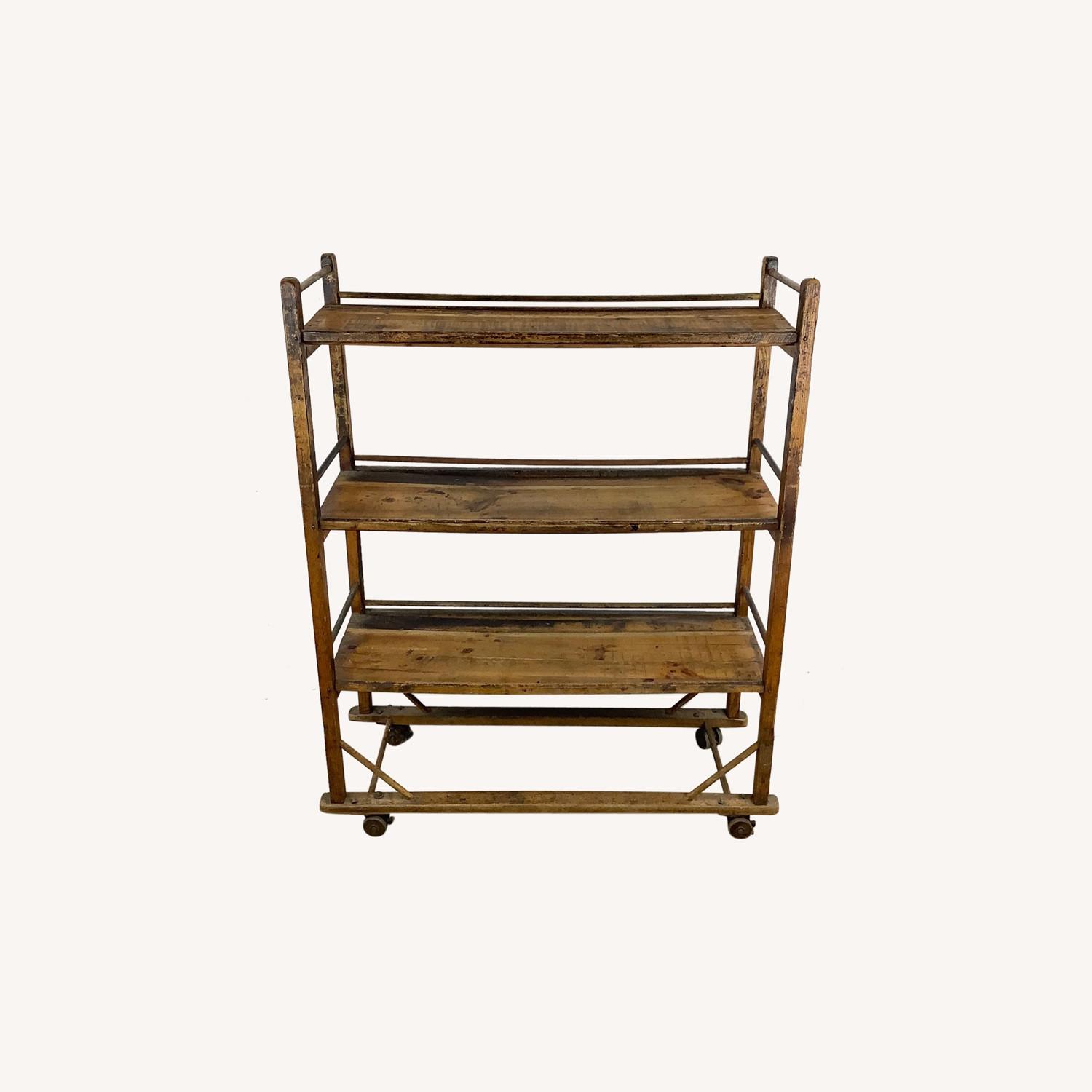 Seller's Notes:This unique antique wooden bakers rack features heavily worn industrial style with wheels that still roll quite well. The three shelf design makes for a great display or utility shelf, perfect for plants, books, or knick-knacks in home or showroom settings. Dimensions: 42w 16d 52.5h (15.5-16 inches between shelves) Condition: age appropriate wear, vintage finish worn, scuffs/scratches, edge wear/cracks, discoloration- see photos.