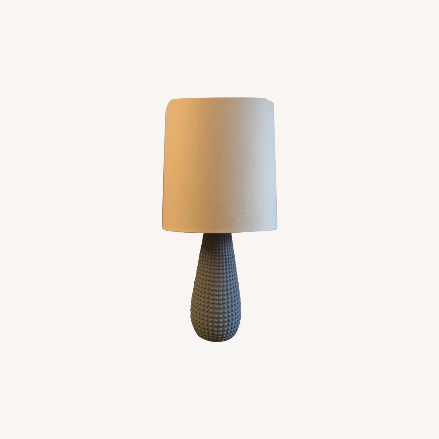 Seller's Notes:Stunning light gray-blue lamp that adds a vintage charm to any room! Found on a shopping whim. We don't want to part with it, but unfortunately will no longer have room for it! There is a slight smudge on the lamp shade (picture shown) but it is not very noticeable and can likely be removed. -15 inch diameter of lamp shade -7.5 inch diameter of lamp base at widest section -31.5 inch total height
