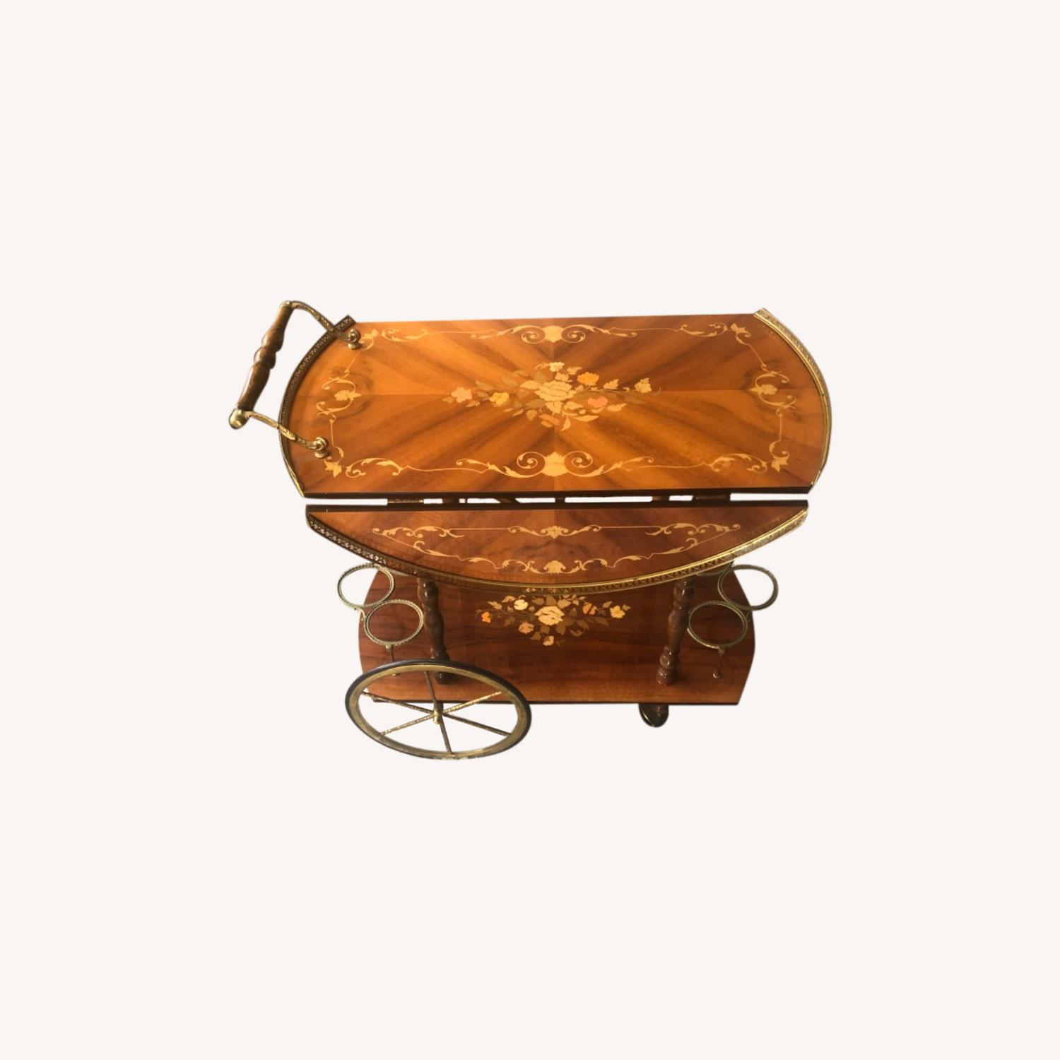 Seller's Notes:Vintage Italian-made marquetry bar cart. Very good condition given it’s age. Lower wine racks to accommodate up to 6 bottles, drop leaf sides for serving and storage versatility, and a beautiful finish to protect the inlaid floral patterned wood. Wheels are in need of grease/adjustment to roll smoothly.