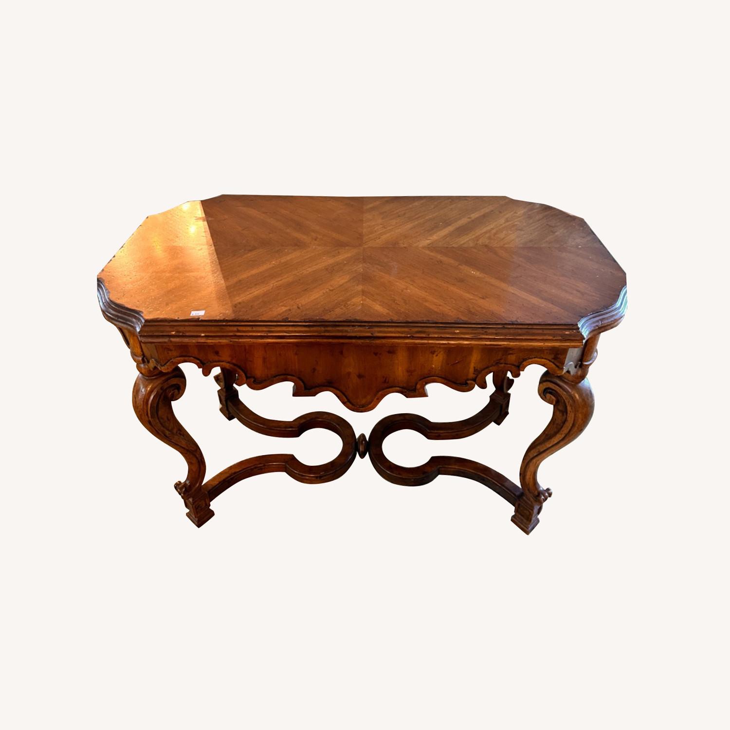 Seller's Notes:Gorgeous One Of A Kind Solid Wood Vintage Side Table With Elaborate And Intricate Carvings / Design — can be used as an entryway/TV/ or entertainment stand! Dimensions: (L) ~48” (W/D) ~20.5” (H) ~28”