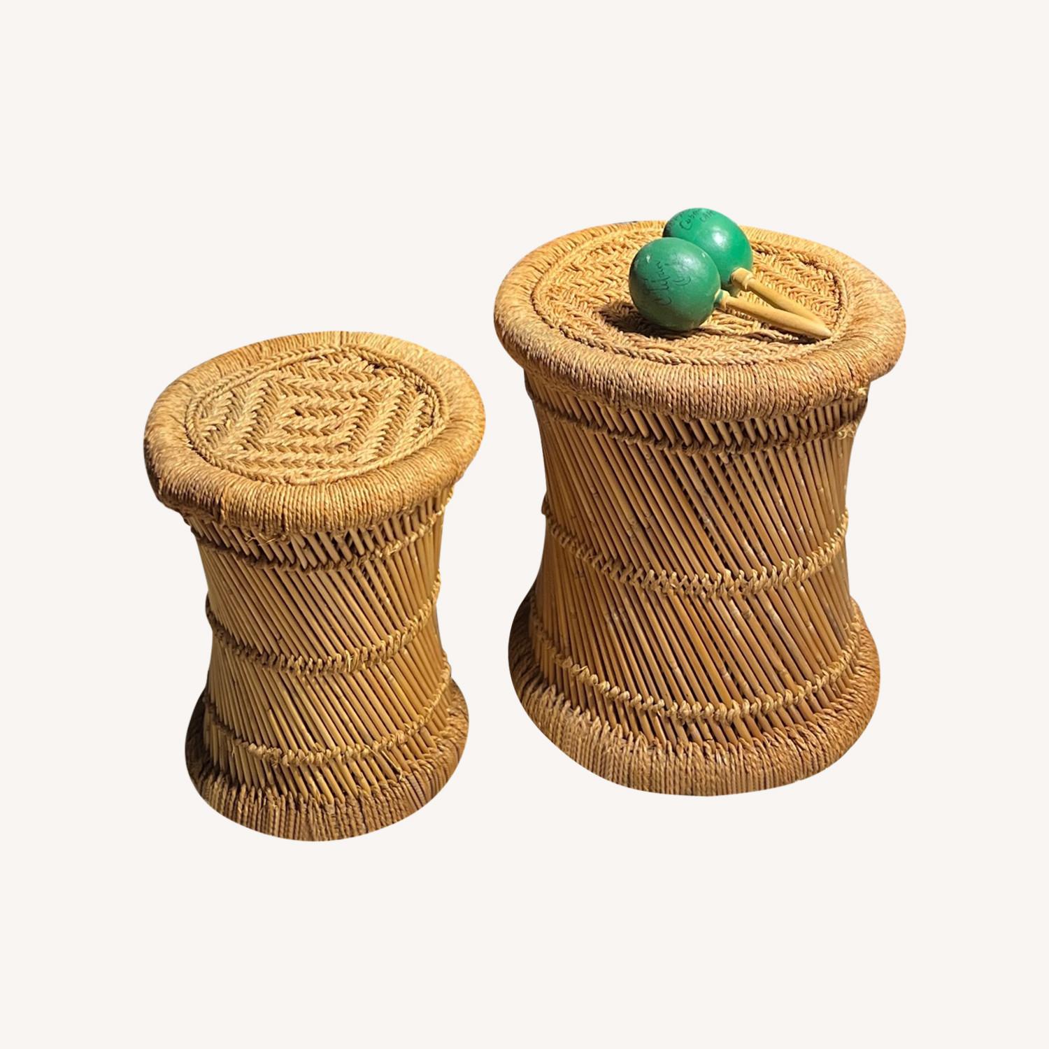 Seller's Notes:Vintage mid century Boho jute wicker pencil Reed bamboo nesting tables or stools with removable tempered glass . great for stools/ ottoman , patio decor or as plant stands excellent preowned condition Medium - 13.5” x 15” Small - 10” x 12.5” FREE SHIPPING