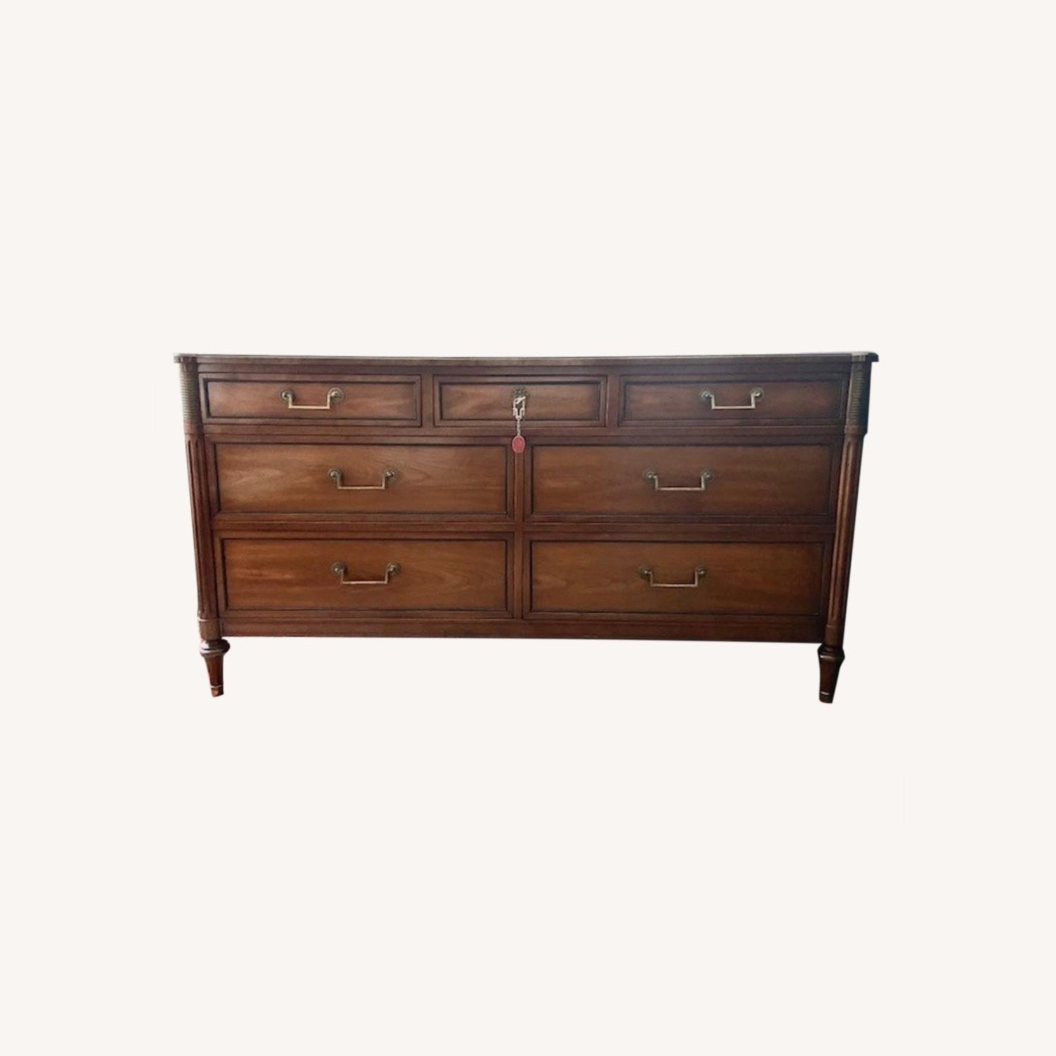 Seller's Notes:Vintage Chest of Drawers from the Louis XVI Provincial Collection made by Kindel Grand Rapids, model #316-22. "Constructed of selected Wild Black Cherrywood veneers with structural parts of solid Cherry," from the Kindel Catalogue of the period. Hand painted details. More than 50 years old and in excellent condition. See last photo for chipped area.