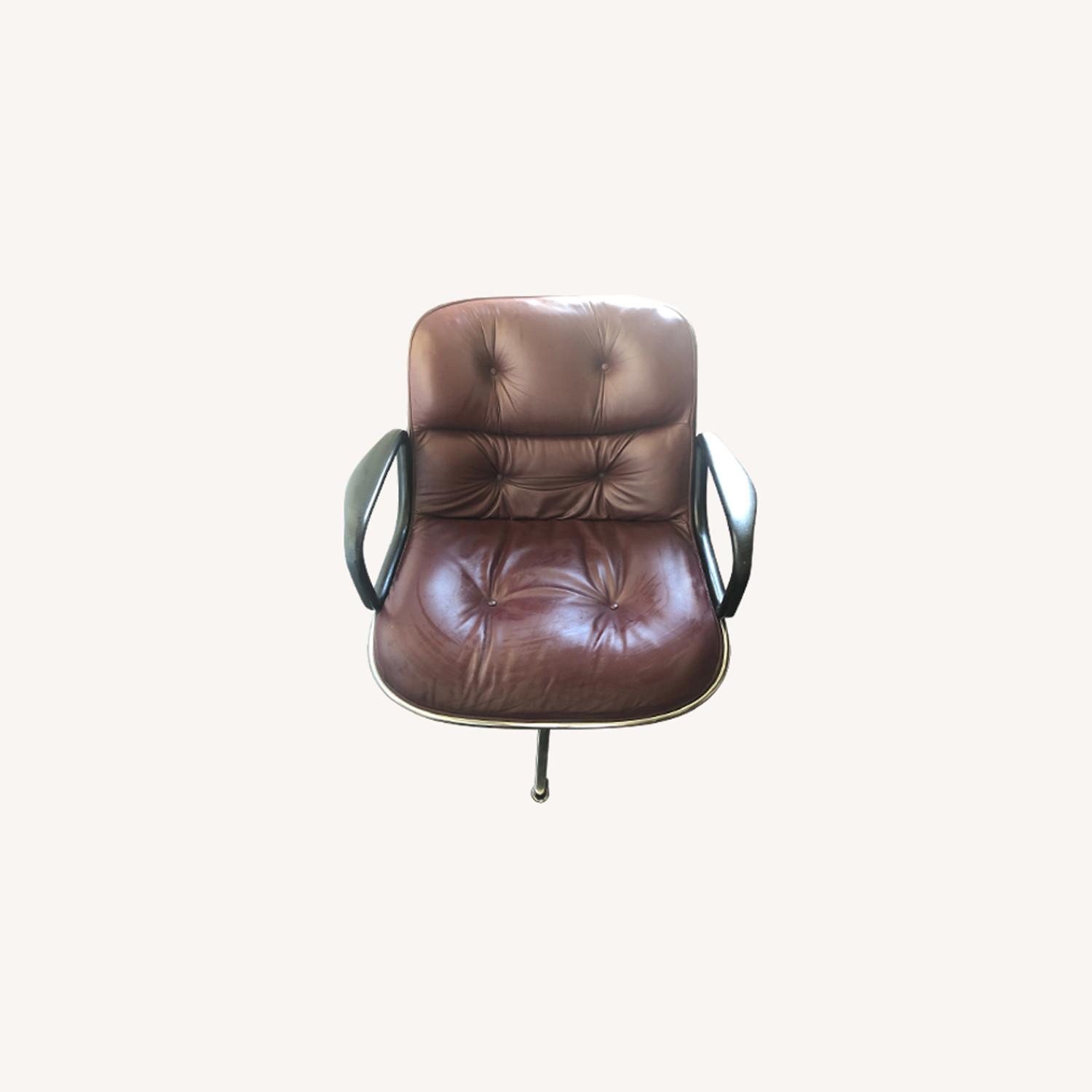 Seller's Notes:The office chair by Charles Pollock for Knoll is an icon of Mid-Century Modern design and revolutionized office seating. They have been in continuous production by Knoll since the 1960s and their timeless design remains contemporary. This 1970’s chair has a hard plastic back, aluminum frame and tufted wine colored leather seat. This chair is in excellent vintage condition with very slight age appropriate creasing in the leather and some small scuffs on the back.