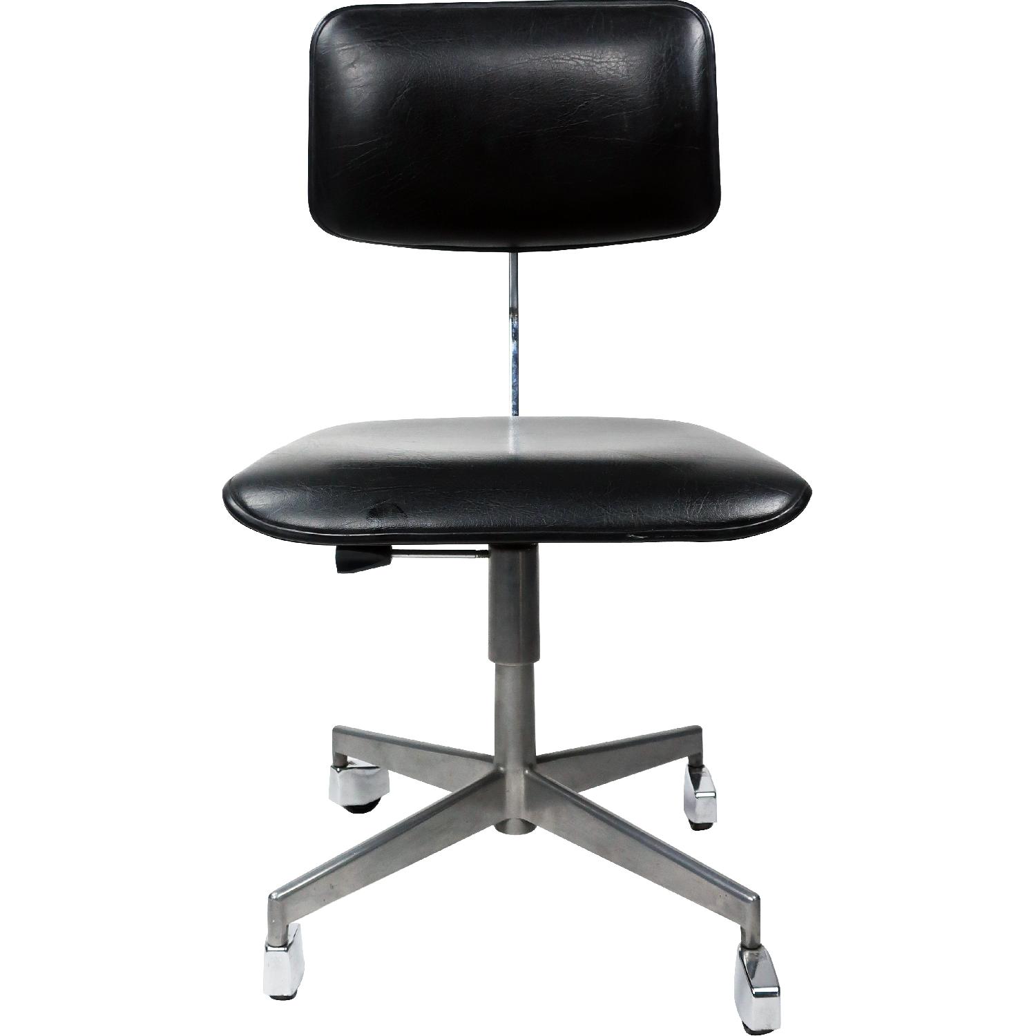 Seller's Notes:This mid-century modern desk chair by Danish furniture maker Labofa has a black vinyl seat with no marks or tears, an aluminum base, and chrome feet and accents. Seat back height and angle are both adjustable and the chair swivels. In great vintage condition, although the chrome shows light pitting from age. Adjustable seat and back. Marked “Labofa” on the chair’s back and each wheel cover. 18” x 18” x 33”
