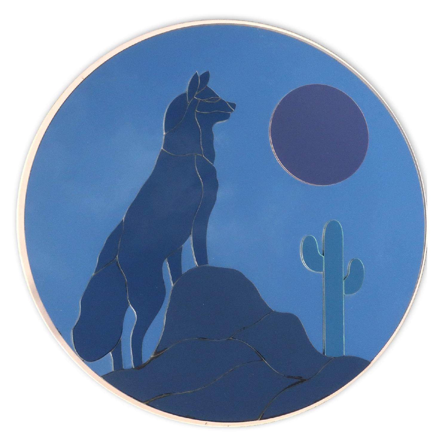 Seller's Notes:It is hard to describe just how stunning this mirror is. Mounted on a white painted wood board, this is three and a half feet wide with colored pieces of mirror applied to a large round mirror to create an image of a coyote or wolf standing on a mountain looking off into the distance with the moon and a saguaro cactus in the background. Perfect for a mid-century, desert, or southwestern modern home. In excellent vintage condition and guaranteed to be THE conversation starter in any home. 42” x 42” x 1”