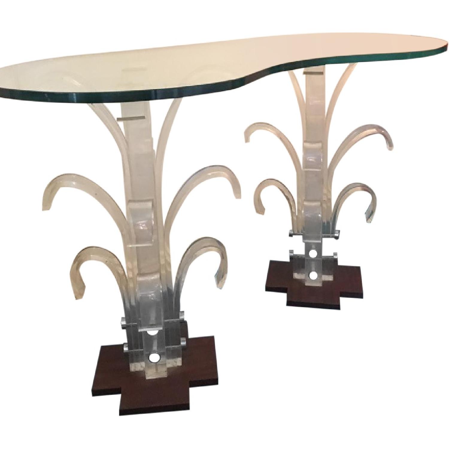 Seller's Notes:This art deco vanity (c. 1930s) is lucite with a wood base under each column. The glass top, and two base columns are all individual and can be arranged in different ways depending on the space and needs. The top is 3/4" glass with a lima bean shape in the front and a flat back. This vanity was purchased from an antique dealer in the early 90s. I have used it in dressing rooms and it has subsequently been in my bedroom for a number of years. It is in excellent condition. I have a lucite chair and stool that are listed on here as well, either would fit underneath as appropriate