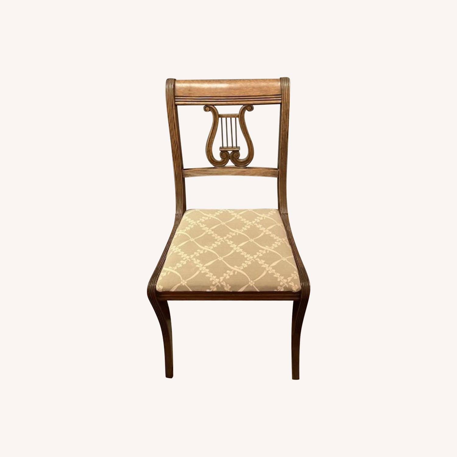 Seller's Notes:Lovely vintage lyre-back chair, ideal for music lover's desk or bedroom! Style has been popular throughout history, but this chair is most likely from 1940s. The seat has been recently recovered in subtle green and gold damask.