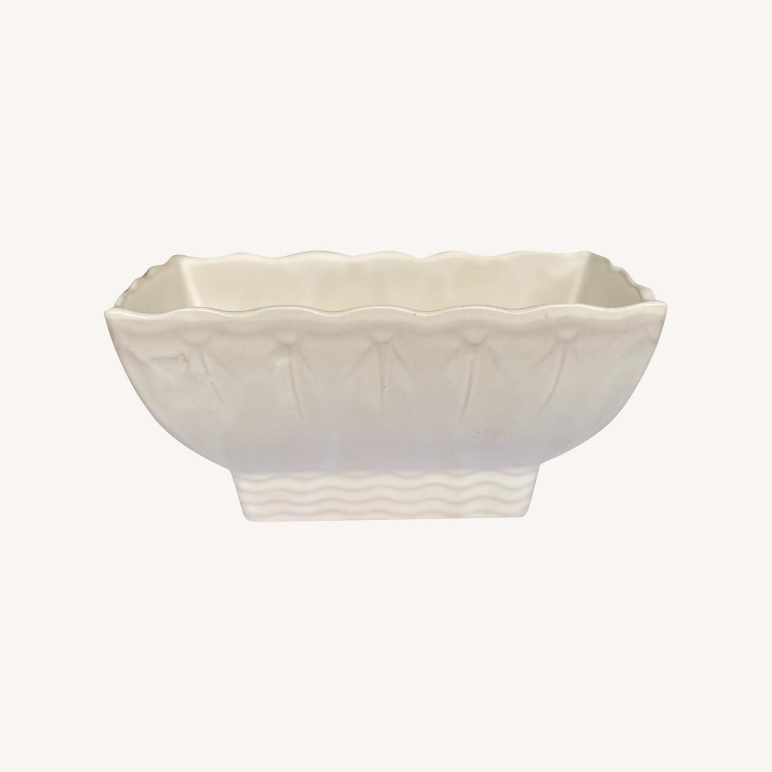 Seller's Notes:Vintage McCoy white pedestal planter approximately 7” wide, 4 1/2” depth and 3 1/2” high. The planter has scalloped edges and is in excellent condition.