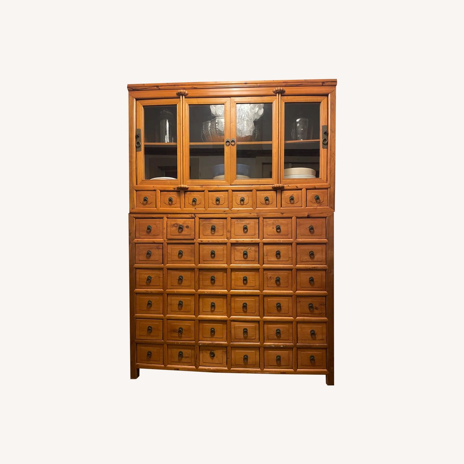 Seller's Notes:Solid wood vintage medicine cabinet. It’s two pieces stacked on one another to make it easier to move. Plenty of storage in the top glass windows plus the 44 smaller drawers. Two separate dimensions below: Top piece: Length: 55” Width: 25.5” Height: 34” Bottom Piece: Length: 55” Width: 24” Height: 45” Total Height when stacked 79”