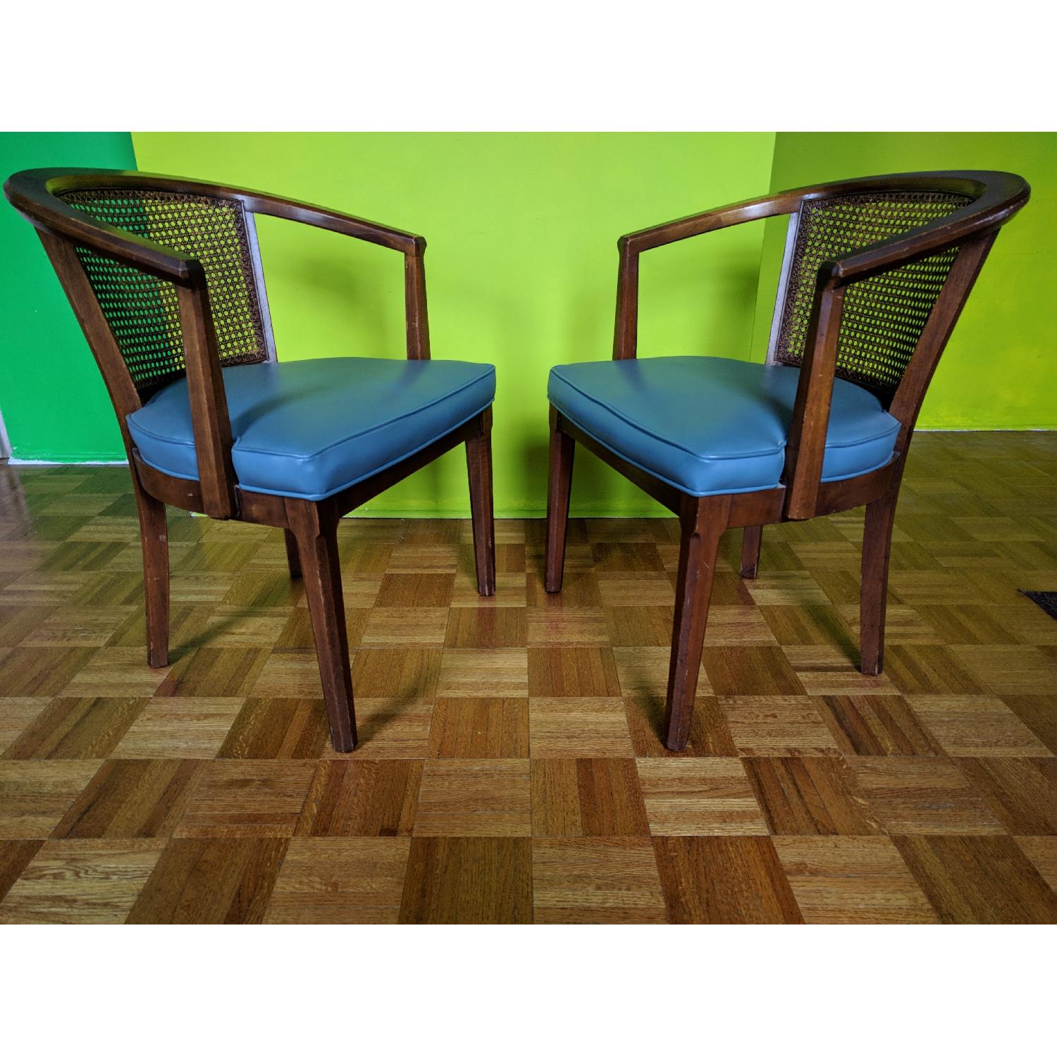 Seller's Notes:These chairs are in great condition, the wood is a little scuffed, but the backings are fully intact and the leather seats are undamaged and comfy. They are at least 60 years old. The seat cushion is at 18", the arm rests are at 27" in the front, and rise to 31" in the back.