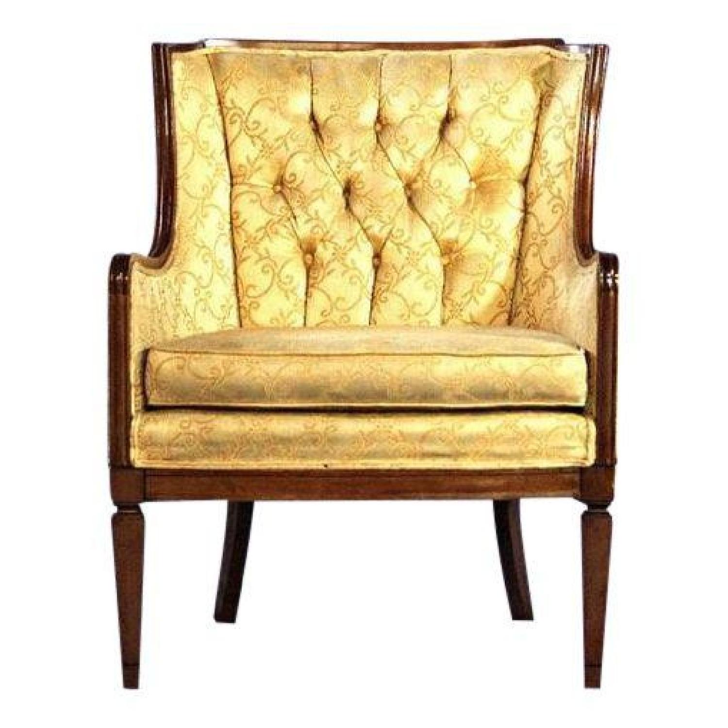 Seller's Notes:Create a grand style statement for inviting accent seating without sacrificing the comfort you are looking for. Feel like a king or a queen diving into this sumptuously comfortable armchair that will leave you powerless to resist its charm! Dimensions: Height 34", Depth 23", Width 26". This beautiful mid-century traditional style tufted armchair is a unique addition to the living room in your home. It has a striking, yet elegant appearance, and you will love the sophistication it adds to your living room decor. This incredible chair is truly a timeless treasure of household elegance. ****Treasure Island Interiors**** Offered in very good vintage condition, stands sturdy and secure, some wear to upholstery and a tear on left arm as shown at pictures. The pictures are of the actual item you are purchasing, so please look at them closely to confirm its condition and outstanding appearance, as they are part of the description. This rare chair possesses fantastic vintage appeal. It is truly a treasure and investment for the generations. Vintage items are incredible pieces of history and are always in style. They also offer a meaningful way to contribute to the environment by recycling pieces from the past. Comes from a clean, non-smoking, pet-free home. This incredible chair possesses all the beauty and majesty you would hope for from the finest vintage furniture money can buy. It will certainly serve and delight its new owner for many years to come, receiving comments and compliments as long as you own it.