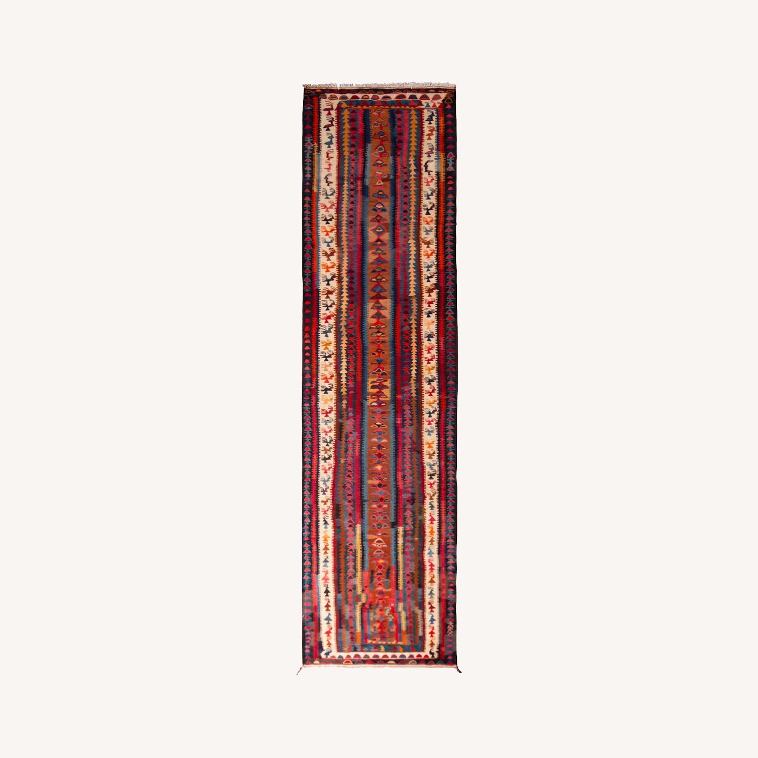 Seller's Notes:Hand woven in wool between 1950-1960, this vintage mid-century Persian kilim runner is an acclaimed Kordi rug hailing from the Quchan region of the Khorasan province, a territory known for historic beauty and quality in Persian rugs. Kordi rugs like this particular runner are known for a silky, sheen wool as can be seen in the subtle glow of the rich colorway pallet, a traditional employ of beige brown, red, gold-orange, black, and both navy and Egyptian blue with such intricate variation complementing the tribal pattern. This particular item offers exceptional condition, ideal for collectors and uncommon in the idyllic vintage pieces found among this revered family, further complemented by a fantastic large size for decorators that’s particularly suitable for entryway, hallway, and stairway projects.