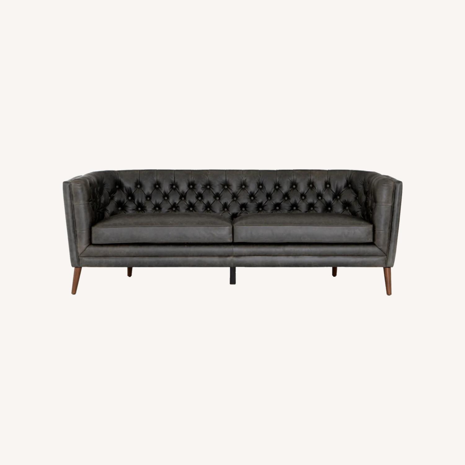 Seller's Notes:Modern materials are gracefully sculpted for a cool, sophisticated feel. Exclusive top-grain leather features dramatic button tufting, supported by cone-tapered parawood legs with a soft-curved back delightfully reminiscent of mid-century shaping. Rich leather upholstery is finished in a bold vintage black, and supported by warm almond-toned wooded legs.