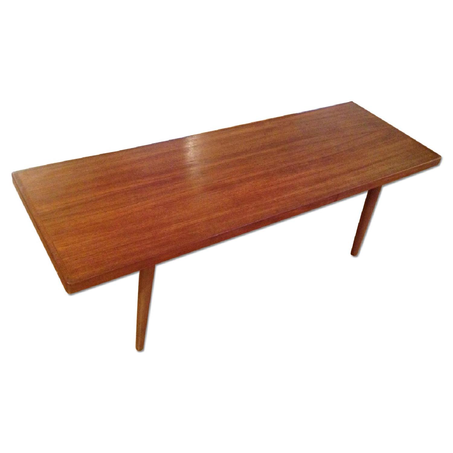 Seller's Notes:This is a beautiful mid-century modern coffee table we purchased at a vintage store in SOHO in the late 1990's. I'm not sure, but it looks like teak. It has been stored for the past several years since it doesn't fit in our living room anymore. It is solid wood, and has some minor scratches and ring marks, which can been seen from certain angles, and which could be rubbed out with fine steel wool and restore-a-finish, or something similar. The legs can be removed for easy transport.