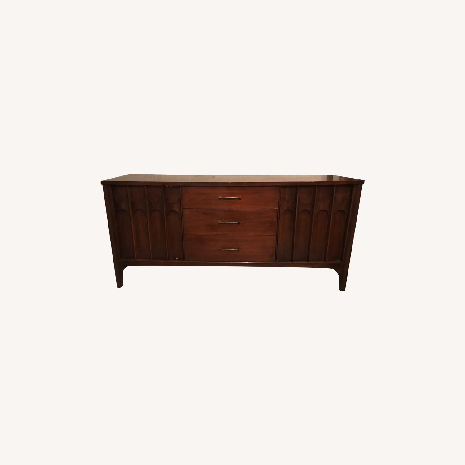 Seller's Notes:Vintage Mid Century Modern Credenza. We've had this for four years, and taken great care of it. As you can see in the top photo, there are some slight discolorations on the top of the wood, that could easily be restained. The curving wood details on the front are quite interesting and unique.