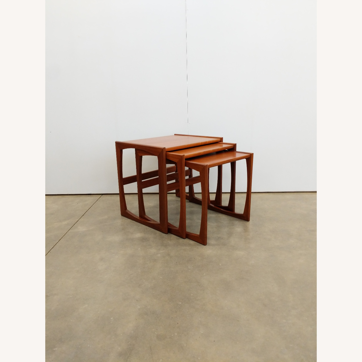 Seller's Notes:Set of 3 authentic vintage mid century modern teak nesting tables / side tables. "Quadrille" series designed by Richard Bennett for G Plan. This set is in excellent overall condition with few signs of age-related wear (see photos). If you would like any additional details, please contact us. Dimensions: Largest table: 19.25" tall 21" long 17" wide Ref: UK4-094